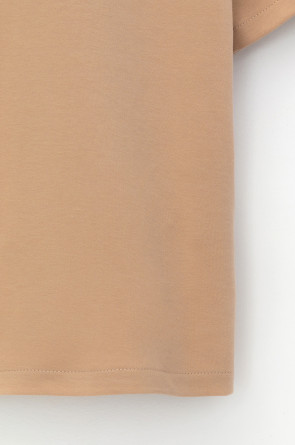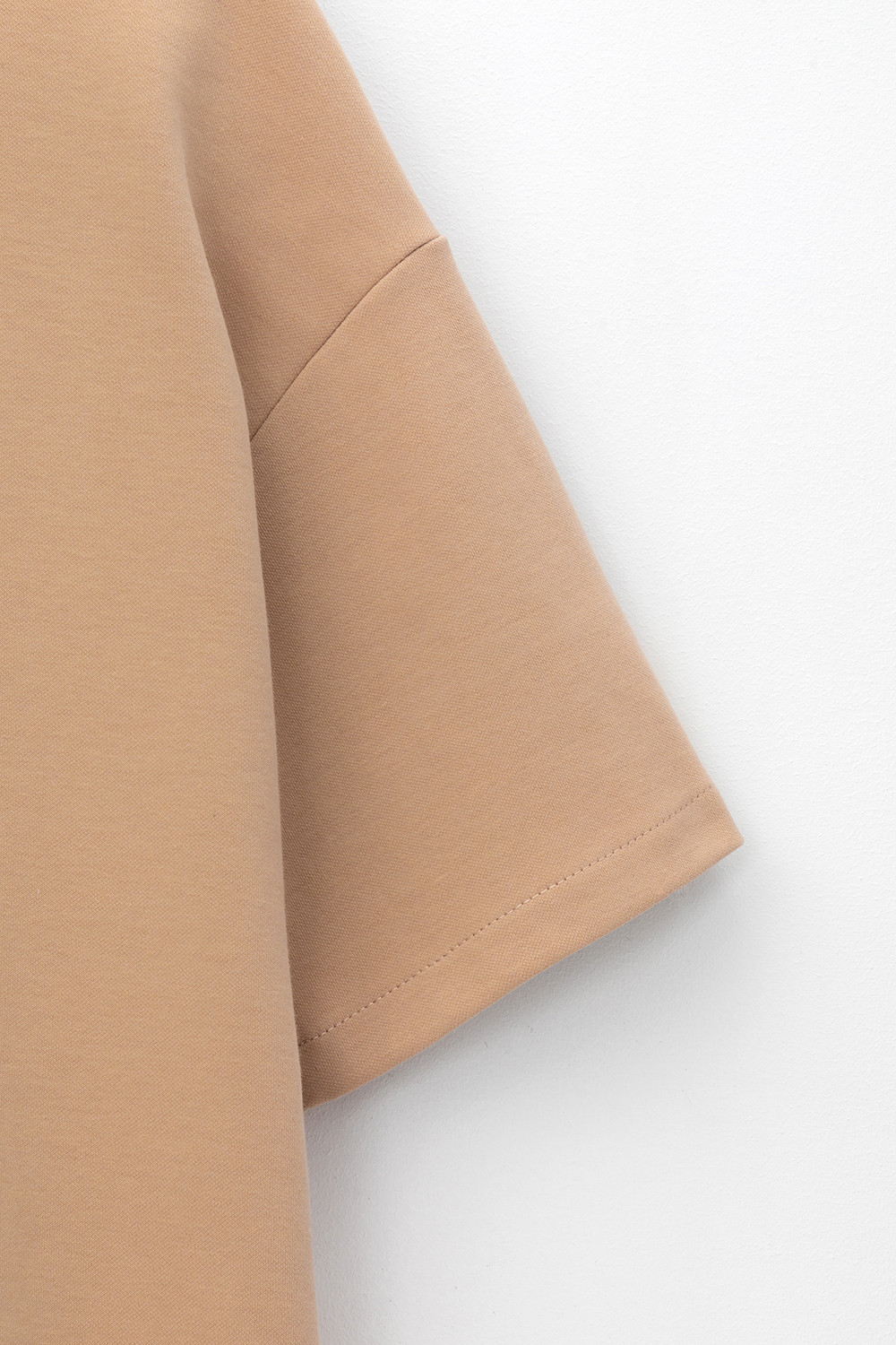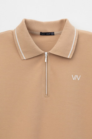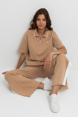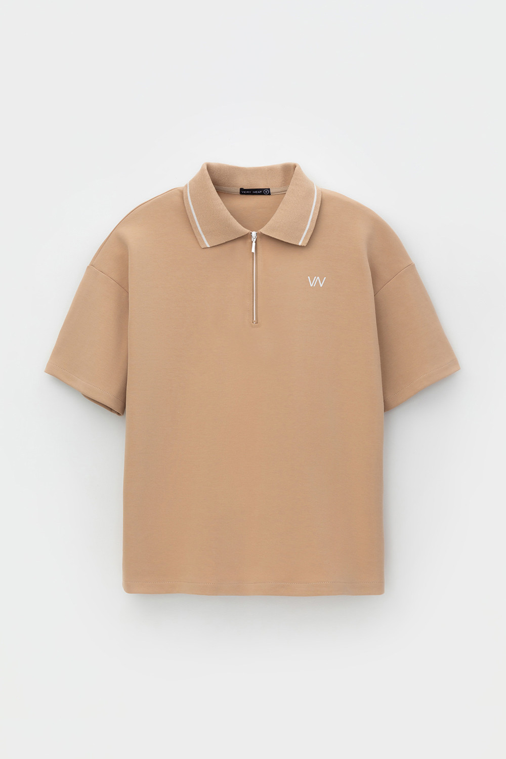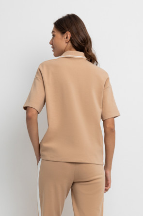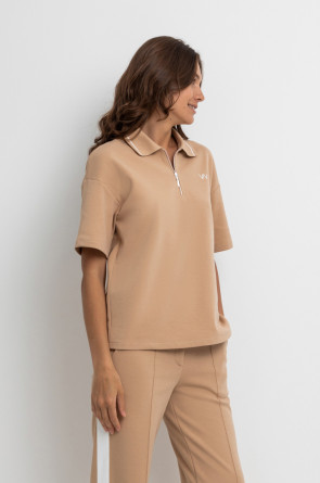 Джемпер поло с короткими рукавами с принтом и вязаным воротником из плотного гладкого трикотажа интерлок с застежкой на молнию . Спущенное плечо придает изделию свободный силуэт.