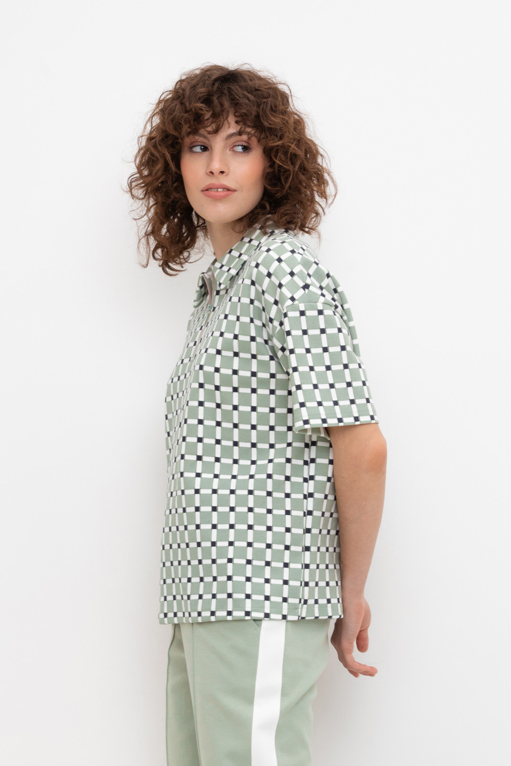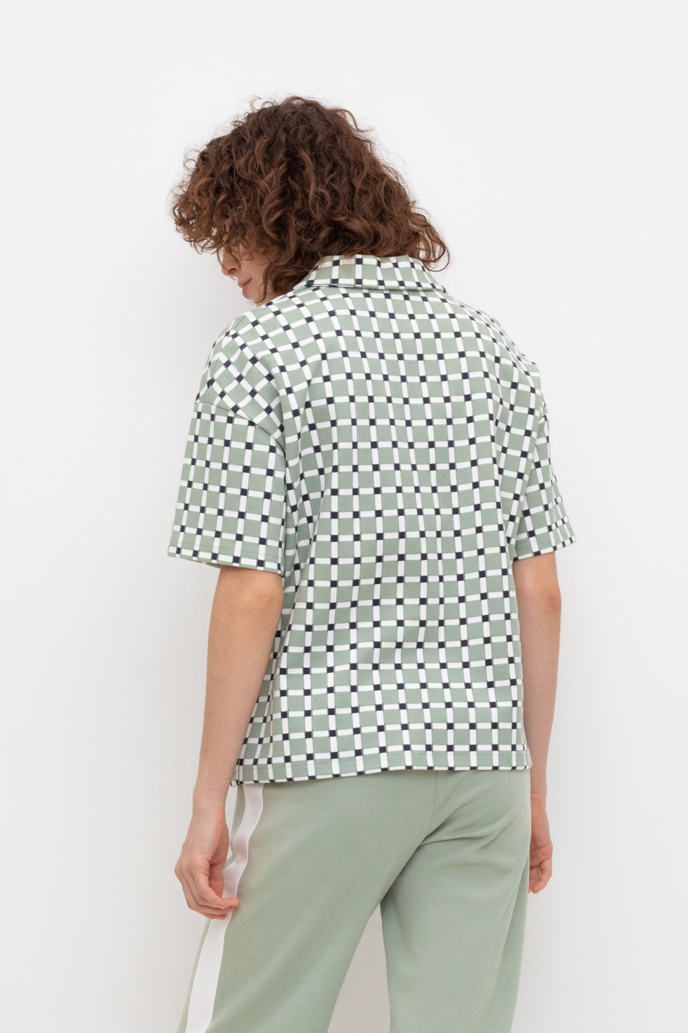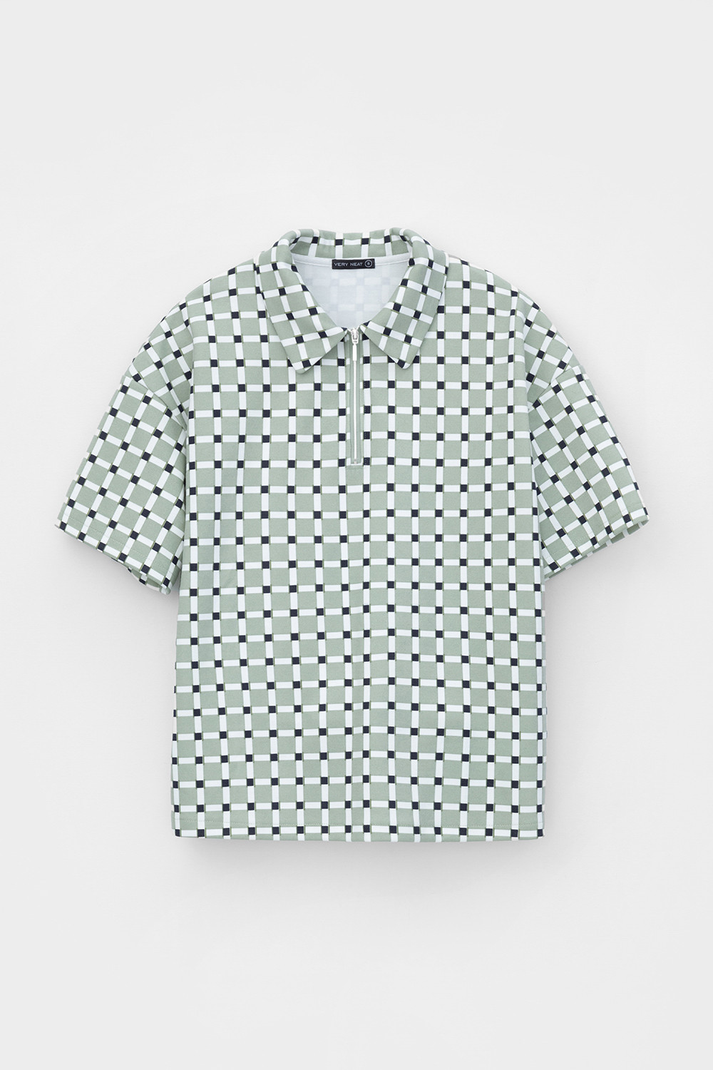 Джемпер поло с короткими рукавами и вязаным воротником из плотного набивного трикотажа интерлок с застежкой на молнию. Спущенное плечо придает изделию свободный силуэт.