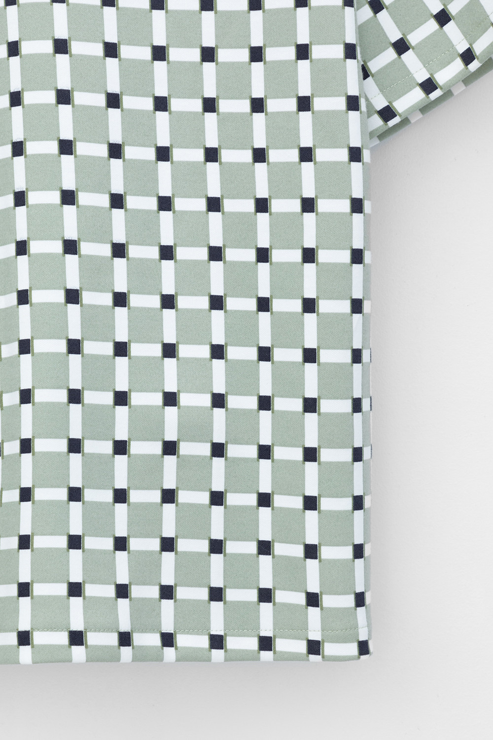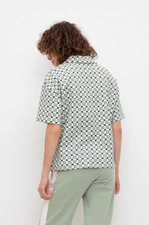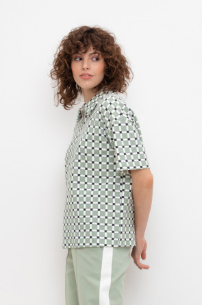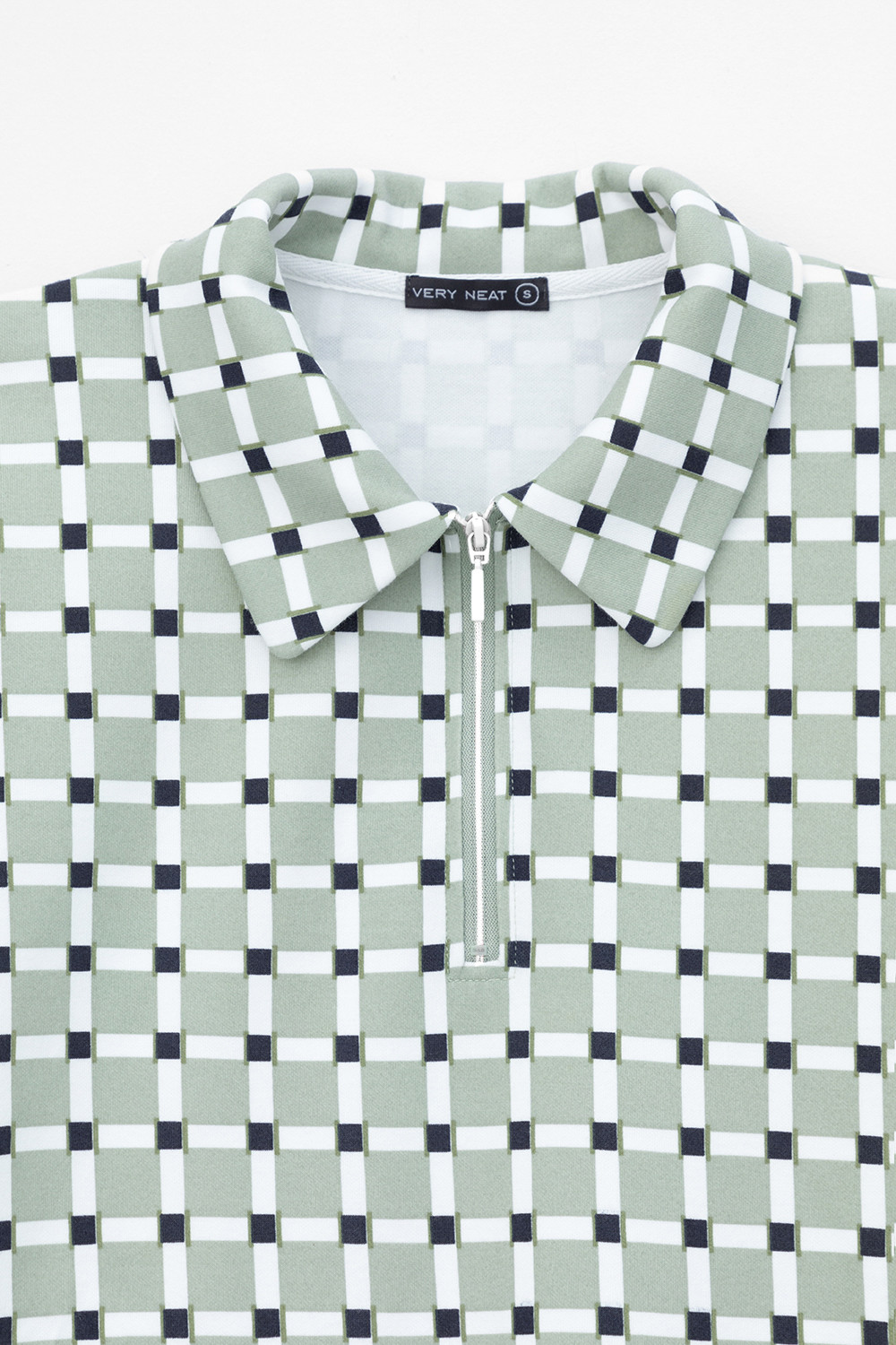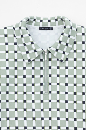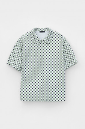 Джемпер поло с короткими рукавами и вязаным воротником из плотного набивного трикотажа интерлок с застежкой на молнию. Спущенное плечо придает изделию свободный силуэт.