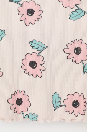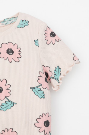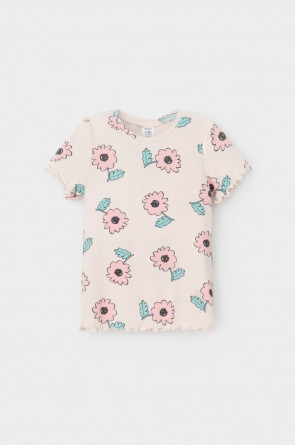 Футболка для девочки из эластичного трикотажа в рубчик. Оригинальная набивка выполнена из стойких текстильных гипоаллергенных красителей. Изделие сохраняет цвет и форму после многократных стирок.