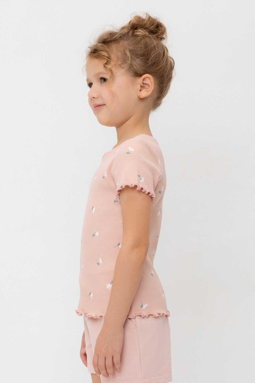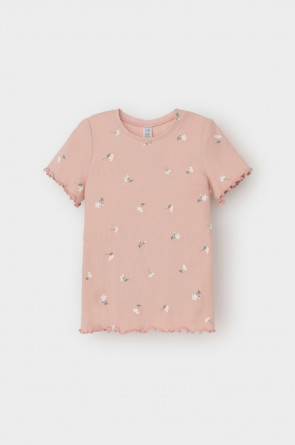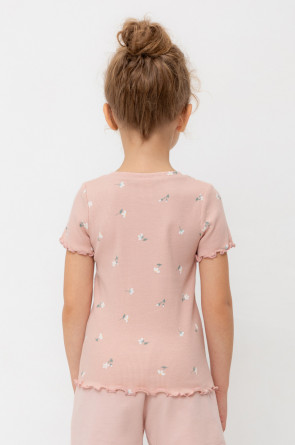 Футболка для девочки из эластичного трикотажа в рубчик. Оригинальная набивка выполнена из стойких текстильных гипоаллергенных красителей. Изделие сохраняет цвет и форму после многократных стирок.