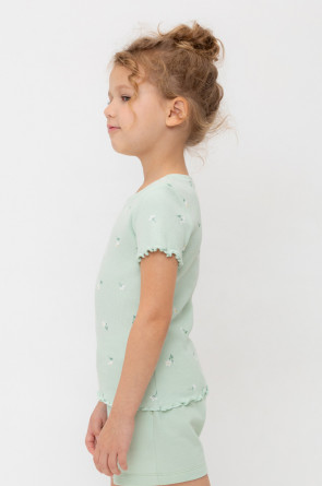 Футболка для девочки из эластичного трикотажа в рубчик. Оригинальная набивка выполнена из стойких текстильных гипоаллергенных красителей. Изделие сохраняет цвет и форму после многократных стирок.