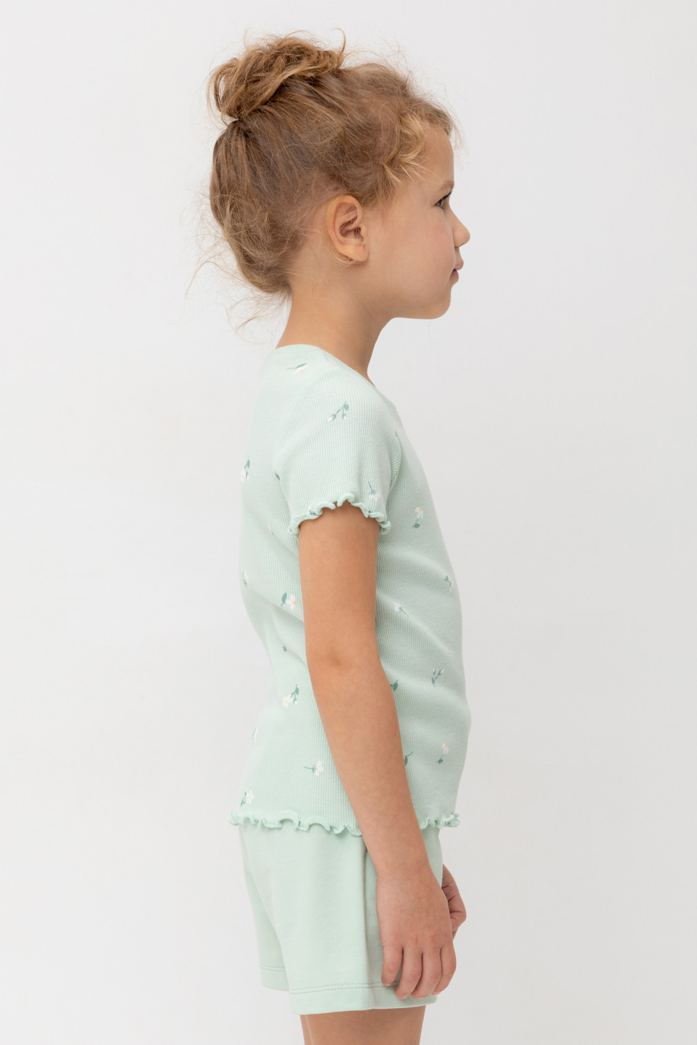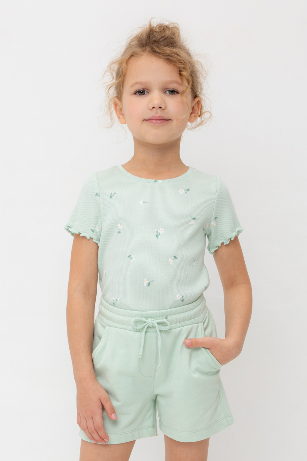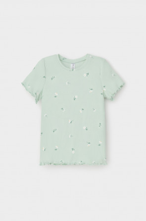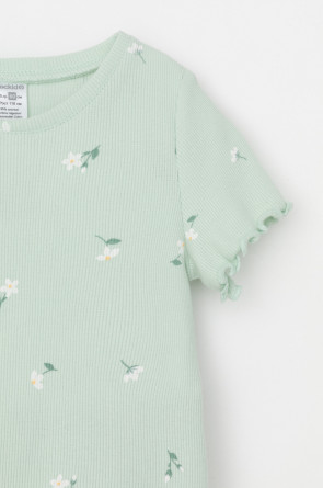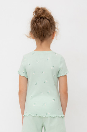 Футболка для девочки из эластичного трикотажа в рубчик. Оригинальная набивка выполнена из стойких текстильных гипоаллергенных красителей. Изделие сохраняет цвет и форму после многократных стирок.