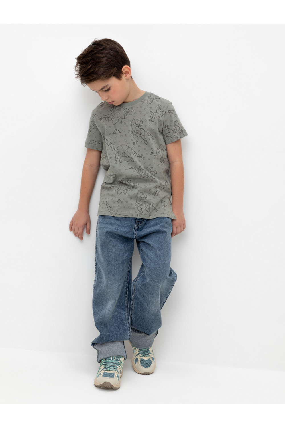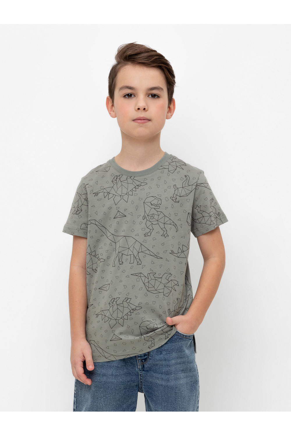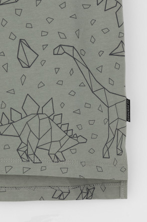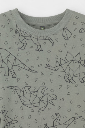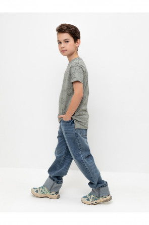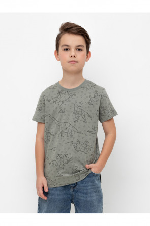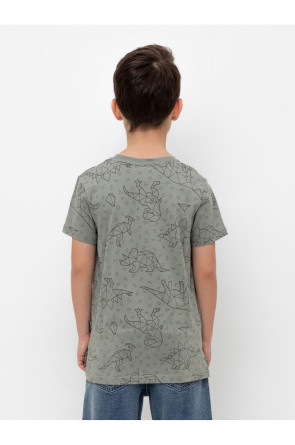 Трикотажная футболка для мальчика из натурального хлопка. У изделия короткие втачные рукава, удлинённая спинка и небольшие разрезы в боковых швах. Оригинальная набивка выполнена из стойких текстильных гипоаллергенных красителей. Футболка сохраняет цвет и форму после многократных стирок.