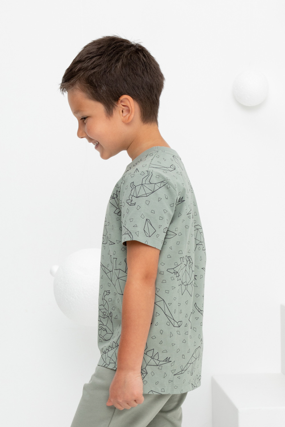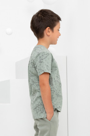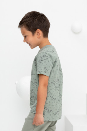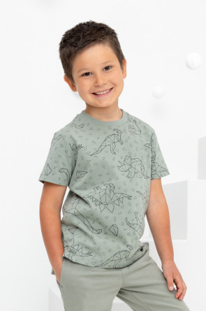 Трикотажная футболка для мальчика из натурального хлопка. У изделия короткие втачные рукава, удлинённая спинка и небольшие разрезы в боковых швах. Оригинальная набивка выполнена из стойких текстильных гипоаллергенных красителей. Футболка сохраняет цвет и форму после многократных стирок.