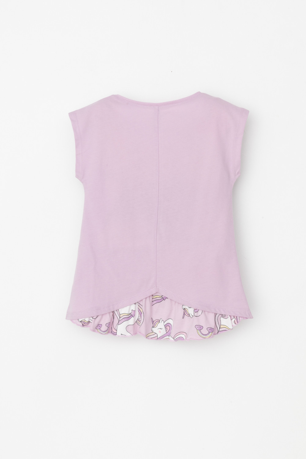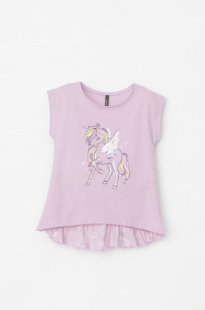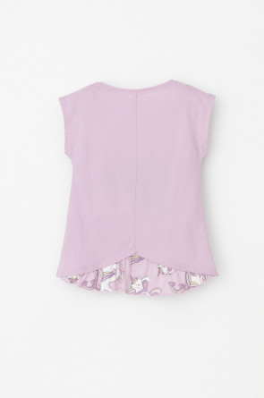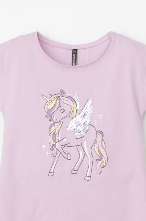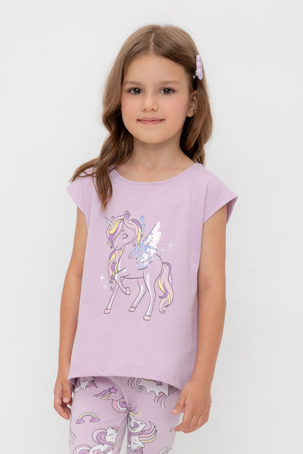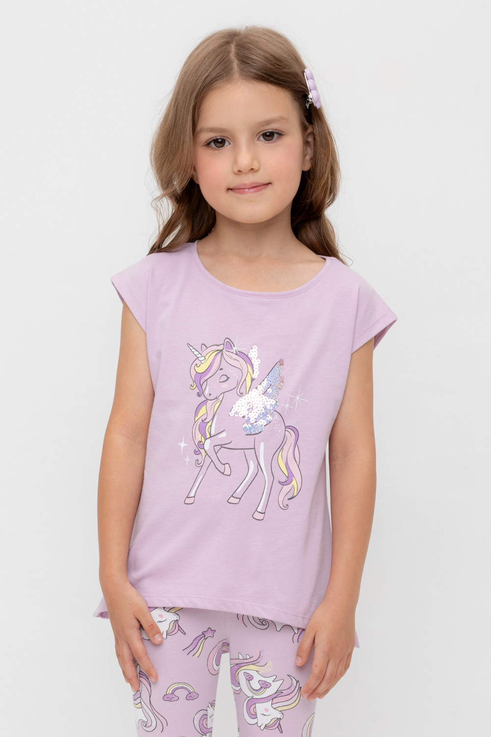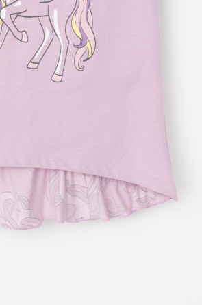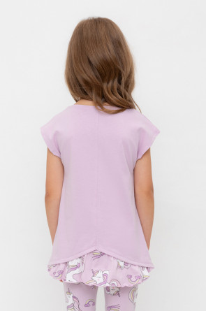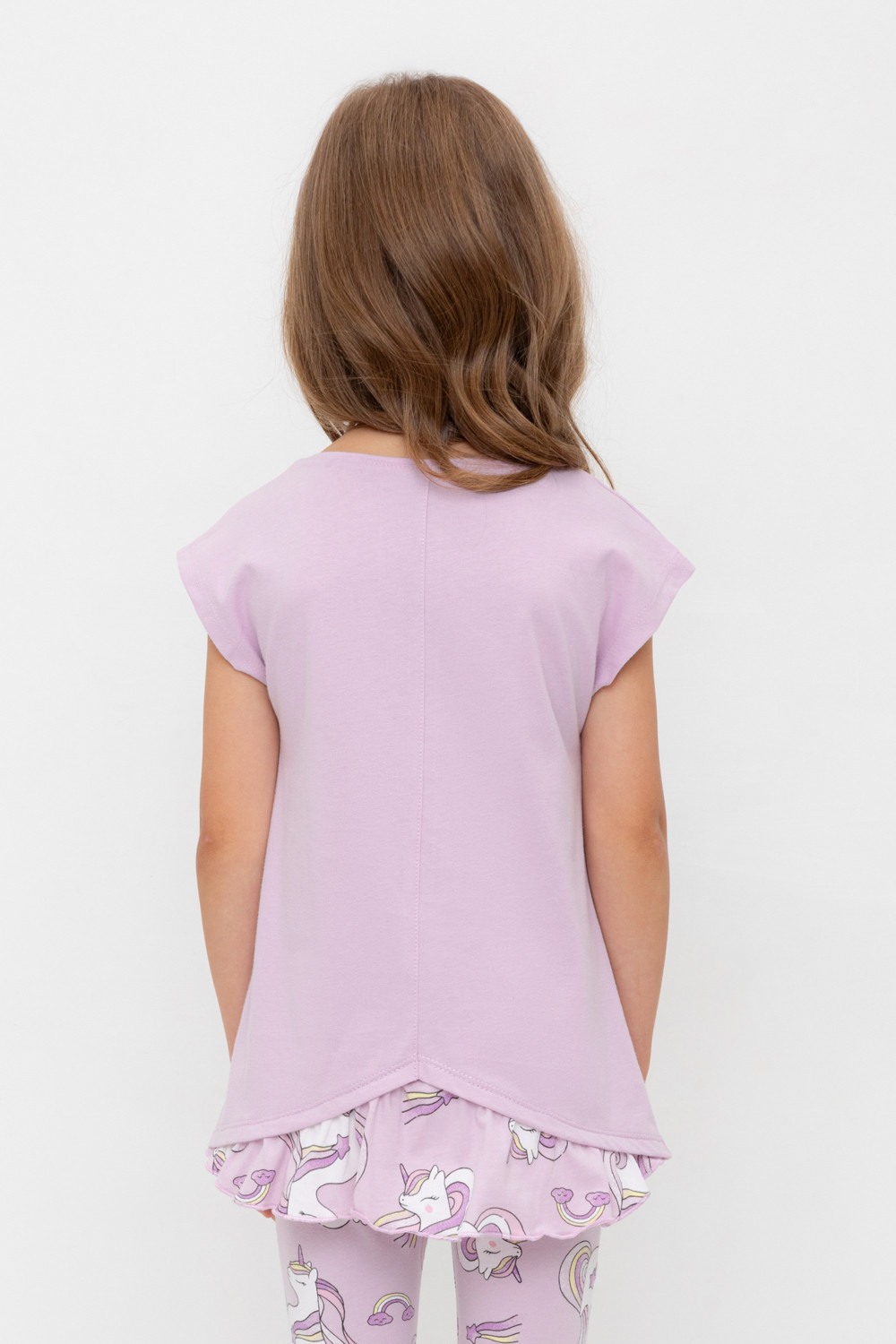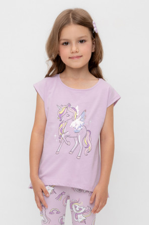 Туника для девочки из высококачественного трикотажного полотна. Оригинальные принт и набивка выполнены из стойких текстильных гипоаллергенных красителей. Для удобства одевания на плече в размерах 92 и 98 есть застежка на кнопки.