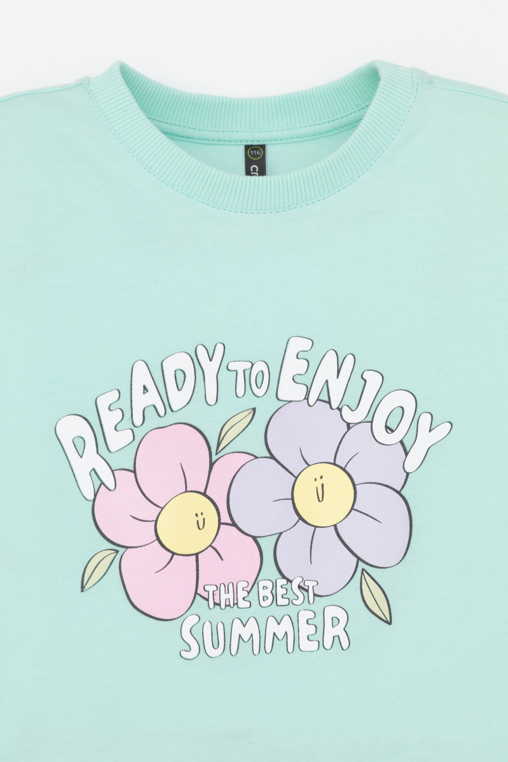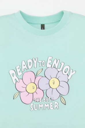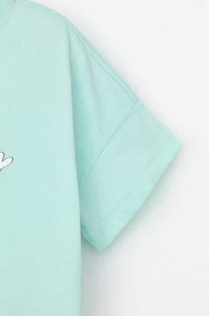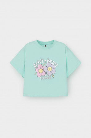 Футболка укороченная для девочки из высококачественного трикотажного полотна. Оригинальный принт выполнен из стойких текстильных гипоаллергенных красителей. Для удобства одевания на спинке в размерах 92 и 98 есть застежка на кнопки.