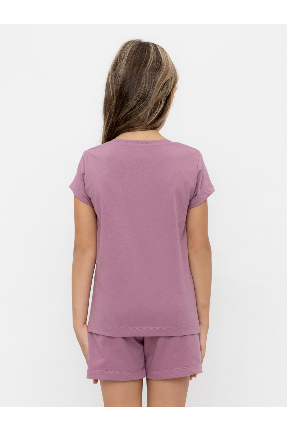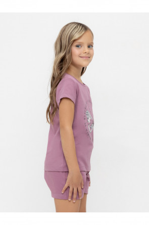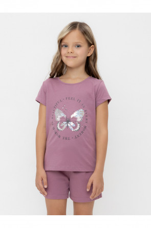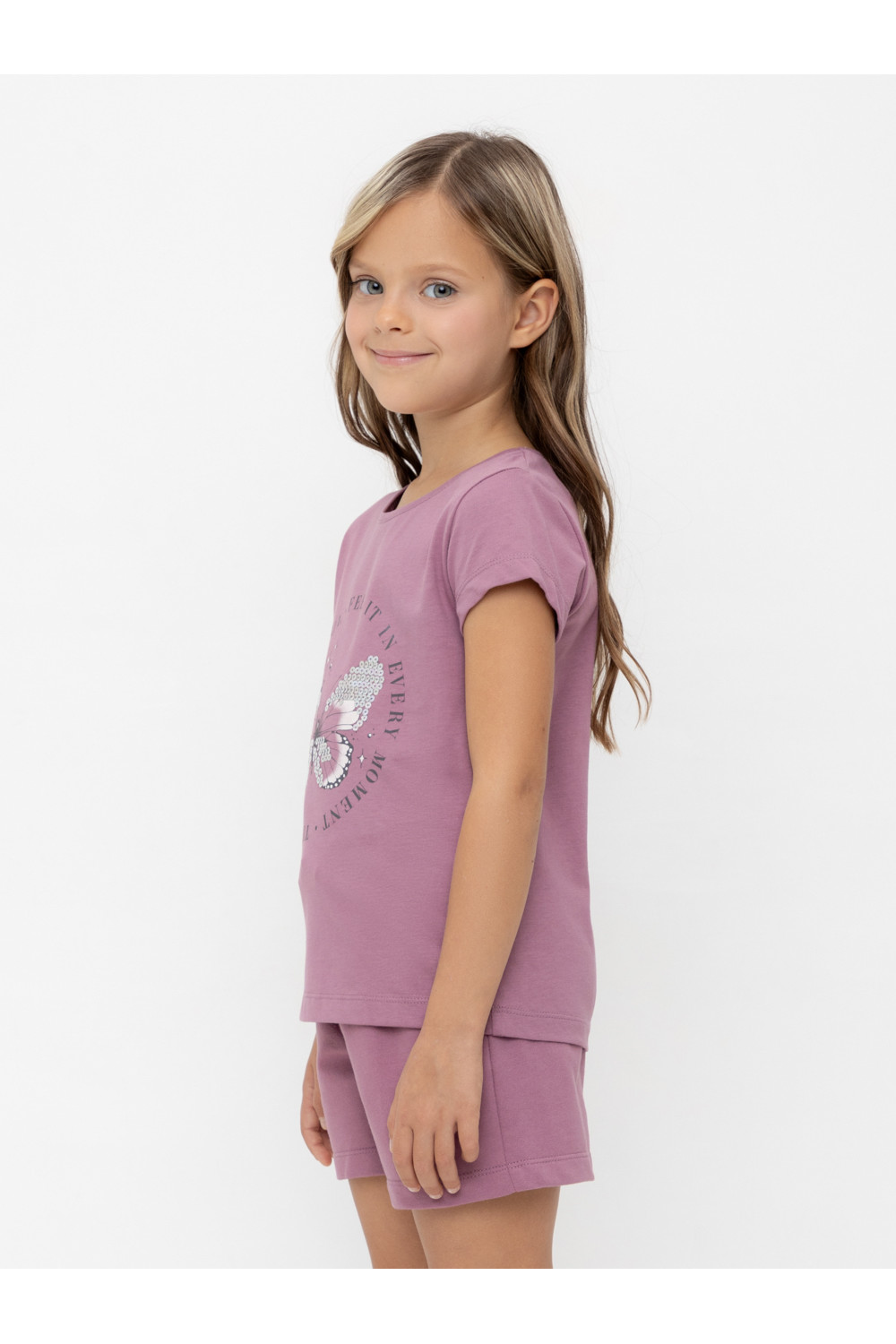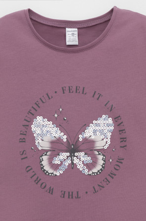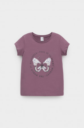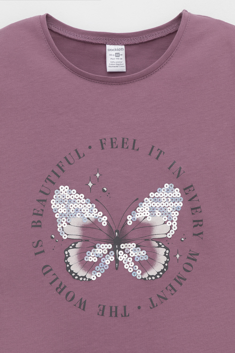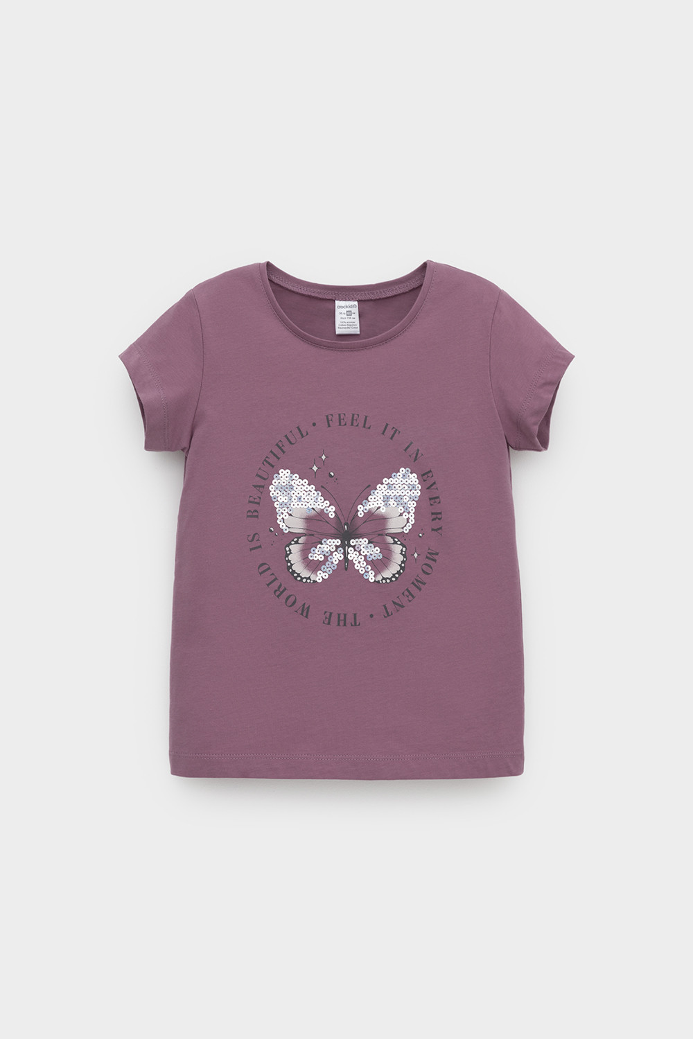 Футболка для девочки из гладкого трикотажа, произведённого из высококачественного натурального хлопка. Для удобства одевания имеется застежка на кнопки в размерах 92 и 98. Оригинальный принт выполнен из стойких текстильных гипоаллергенных красителей и украшен пайетками. Изделие сохраняет цвет и форму после многократных стирок.