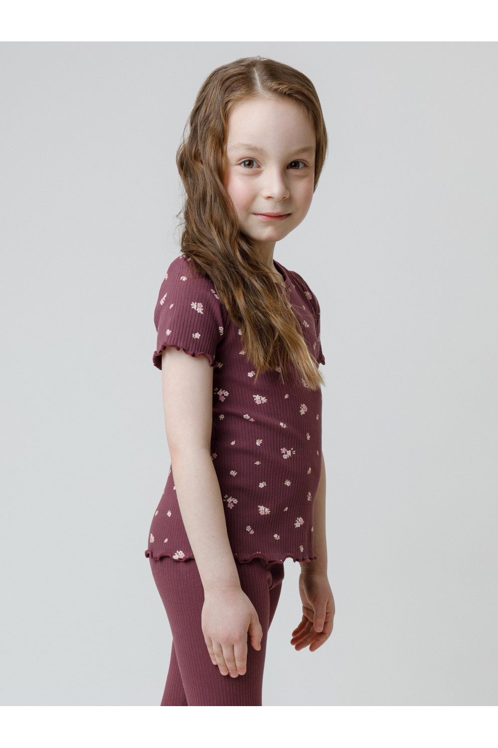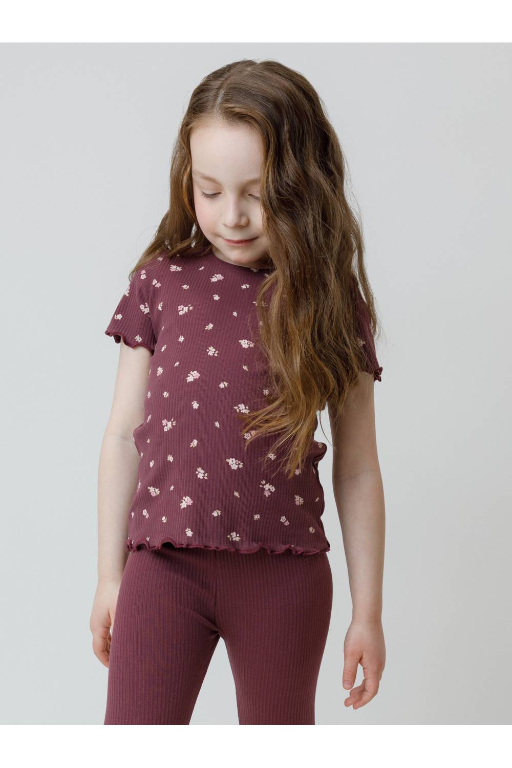 Футболка для девочки из эластичного трикотажа в рубчик. Оригинальный рисунок выполнен из стойких текстильных гипоаллергенных красителей. Изделие сохраняет цвет и форму после многократных стирок. Все трикотажные полотна производятся в соответствии с нормами швейцарского сертификата ЭкоТекс.