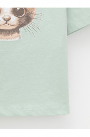 Футболка для девочки из гладкого трикотажа, произведённого из высококачественного натурального хлопка. Застёгивается на спине на кнопки в размерах 92 и 98. Оригинальный принт выполнен из стойких текстильных гипоаллергенных красителей. Изделие сохраняет цвет и форму после многократных стирок. Все трикотажные полотна производятся в соответствии с нормами швейцарского сертификата ЭкоТекс.