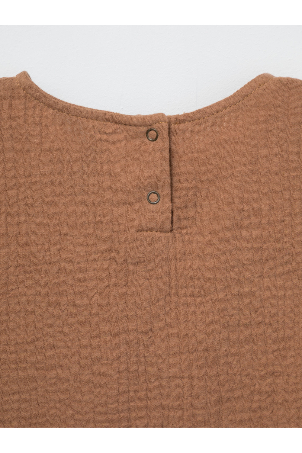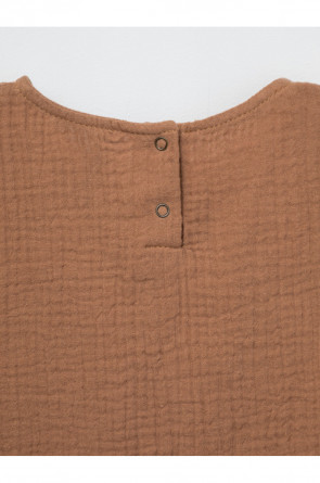 Укороченный топ для девочки из мягкого хлопокового муслина. По спинке застежка на кнопки. Изделие сохраняет цвет, форму и фактуру жатости после многократных стирок.