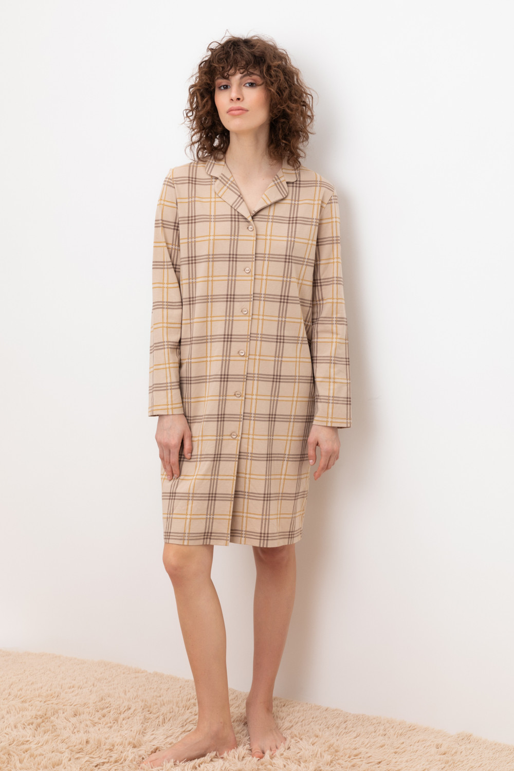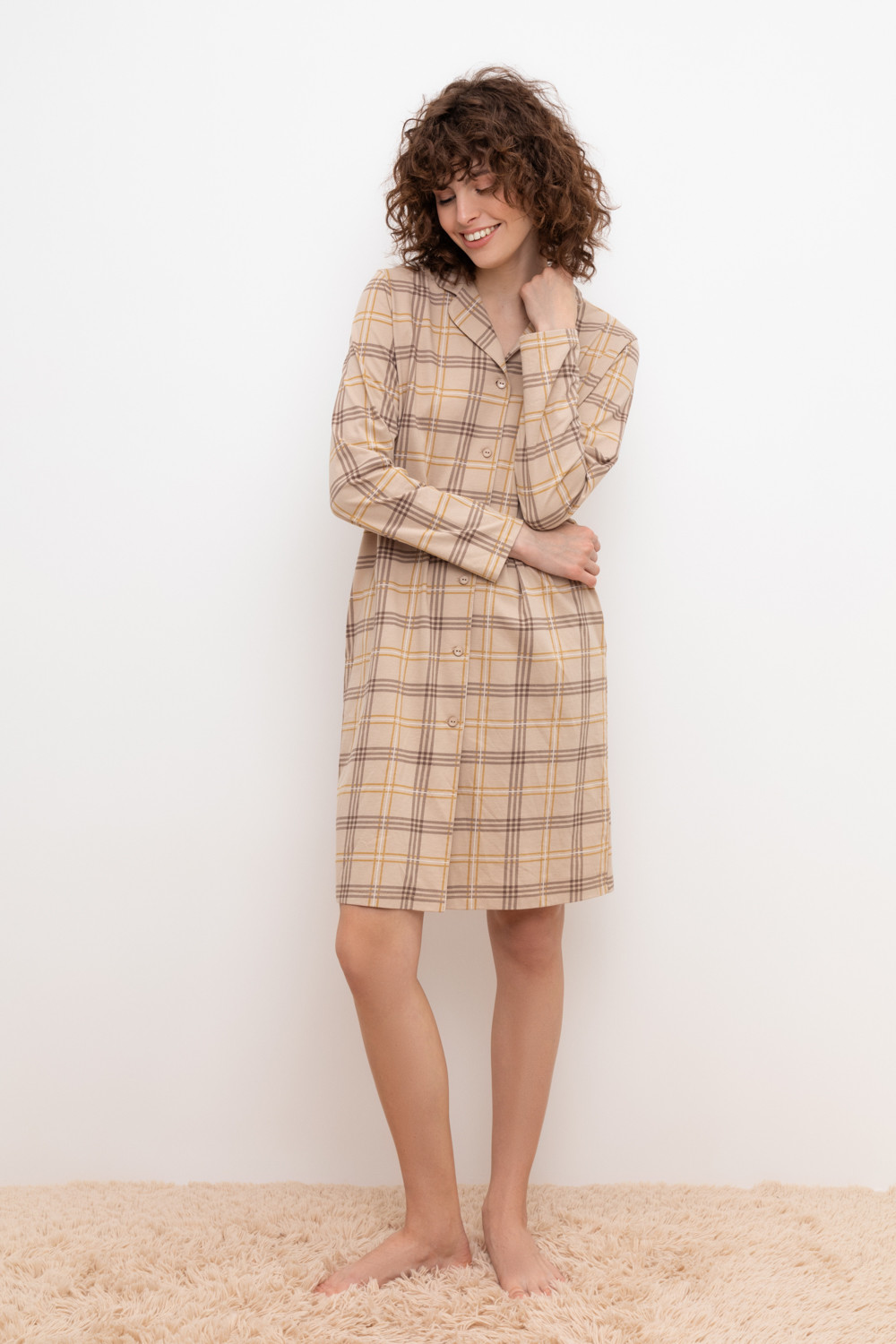 Рубашка-халат с длинными рукавами на пуговицах из набивного трикотажа. Гладкий материал приятен к телу и позволяет коже дышать.