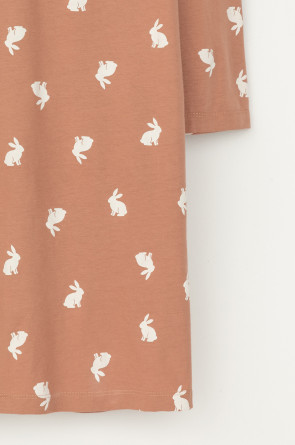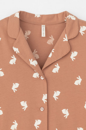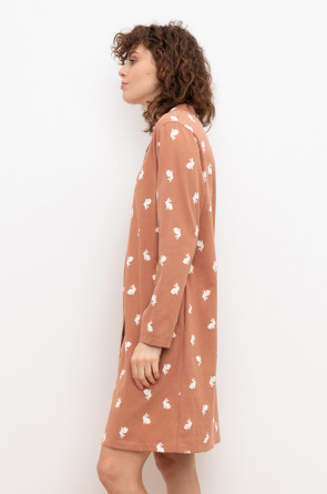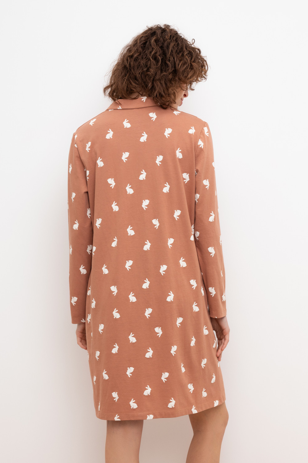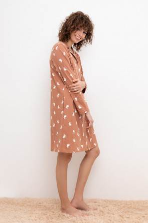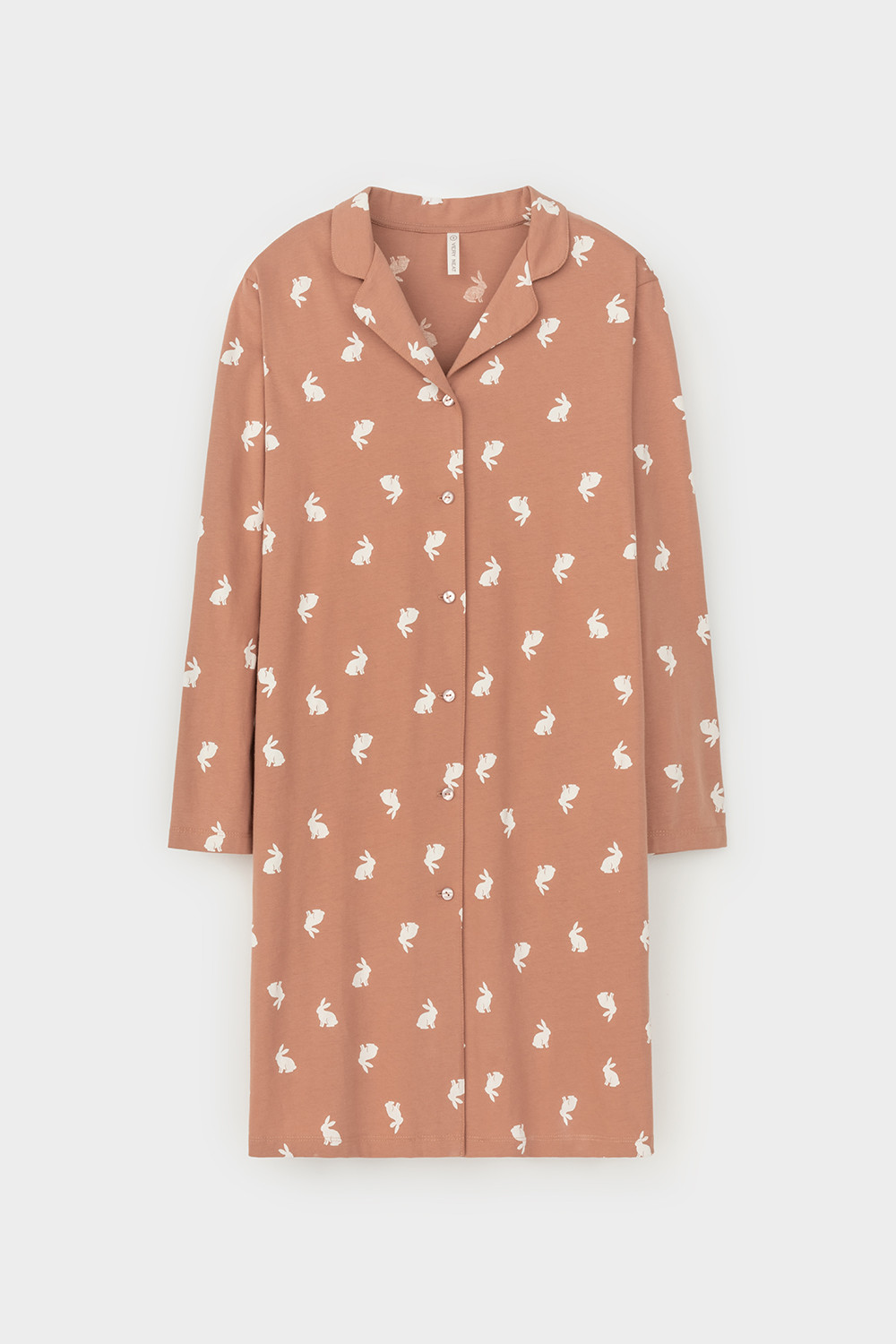 Рубашка-халат с длинными рукавами на пуговицах из набивного трикотажа. Гладкий материал приятен к телу и позволяет коже дышать.