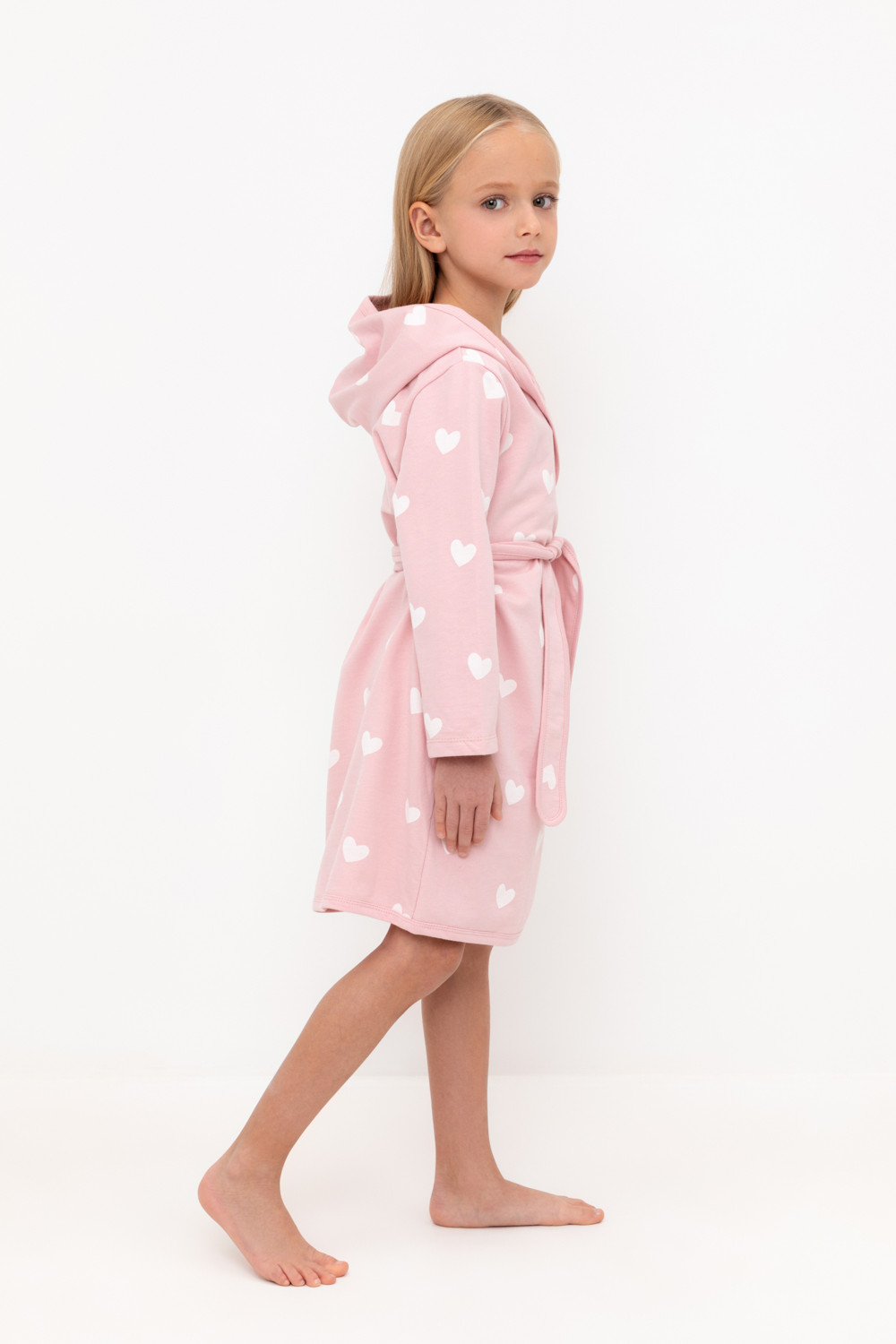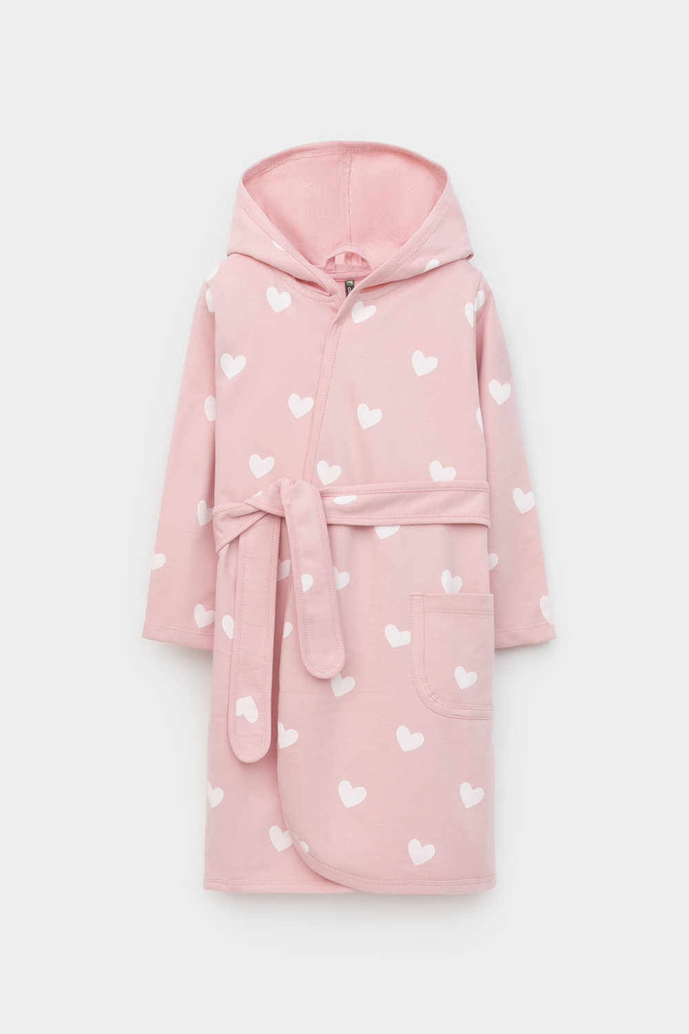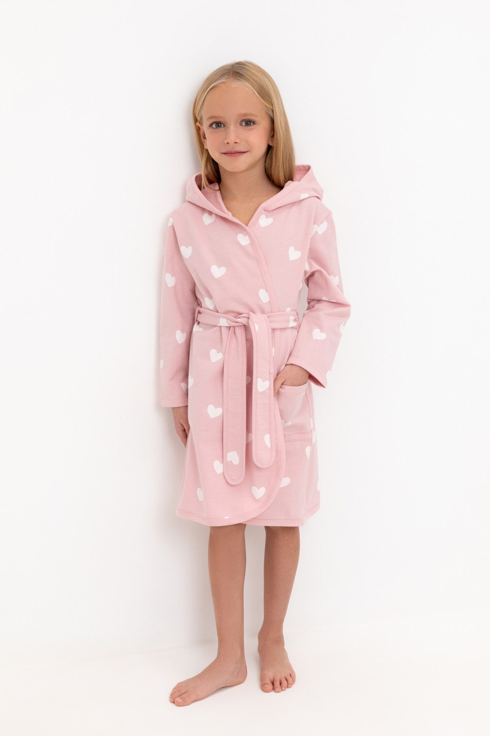 Халат с тонким капюшоном и поясом из набивного хлопкового трикотажа футер петля. Края обработаны мягким кантом. Накладной карман уходит в шов. Пояс продет в шлевки. Длинные рукава обработаны плоскими швами.