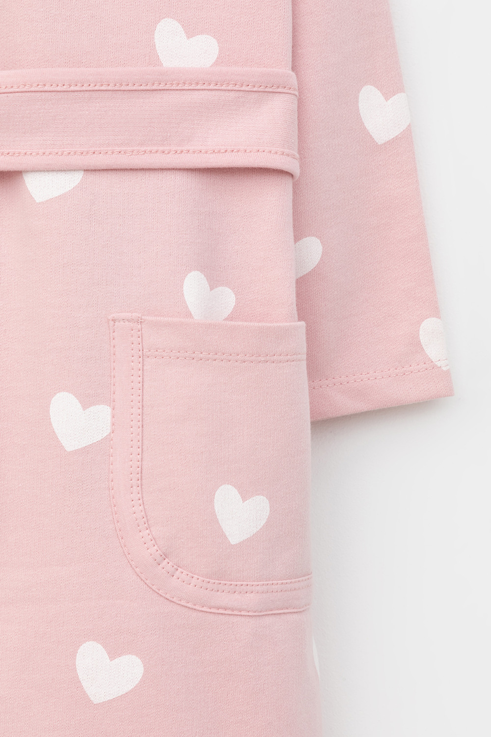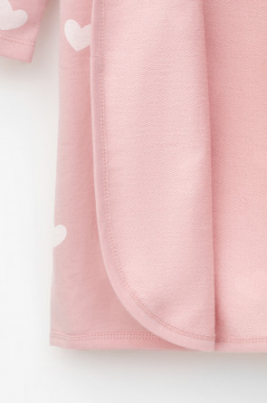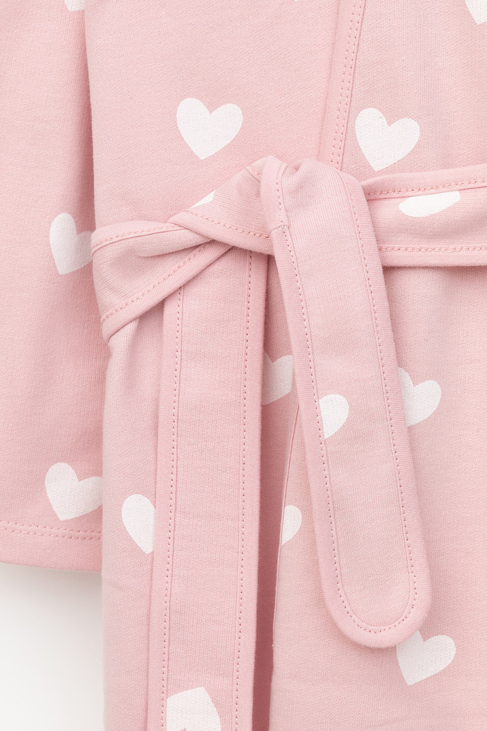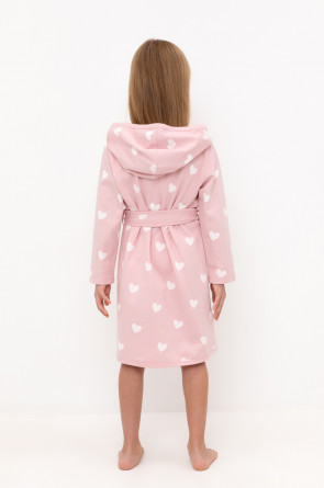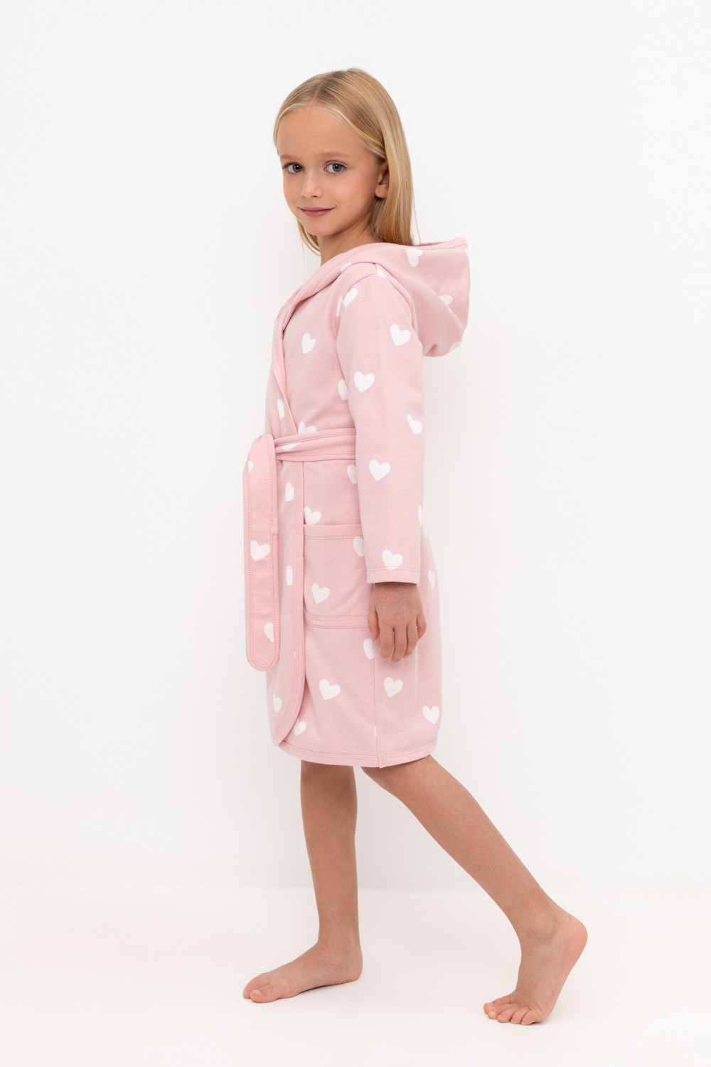 Халат с тонким капюшоном и поясом из набивного хлопкового трикотажа футер петля. Края обработаны мягким кантом. Накладной карман уходит в шов. Пояс продет в шлевки. Длинные рукава обработаны плоскими швами.