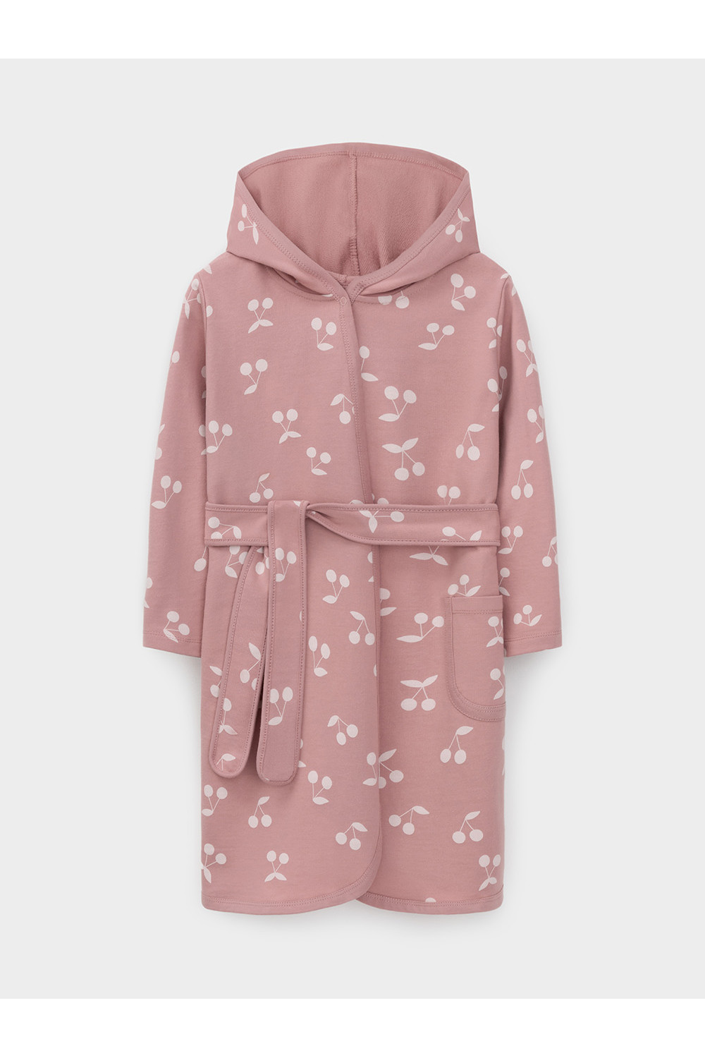 Халат с тонким капюшоном. Изготовлен из набивного хлопкового трикотажа футер петля. С помощью пояса можно регулировать посадку по фигуре. Сверху застёжка на кнопку. Края изделия обработаны мягким кантом. На боку накладной карман, уходящий в шов. Оригинальная набивка выполнена из стойких гипоаллергенных текстильных красителей. Все трикотажные полотна производятся в соответствии с нормами швейцарского сертификата ЭкоТекс.