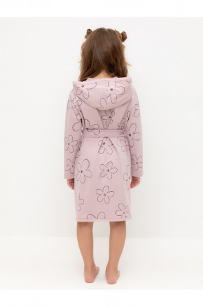 Халат с тонким капюшоном. Изготовлен из набивного хлопкового трикотажа футер петля. С помощью пояса можно регулировать посадку по фигуре. Сверху застёжка на кнопку. Края изделия обработаны мягким кантом. На боку накладной карман, уходящий в шов. Оригинальная набивка выполнена из стойких гипоаллергенных текстильных красителей. Все трикотажные полотна производятся в соответствии с нормами швейцарского сертификата ЭкоТекс.