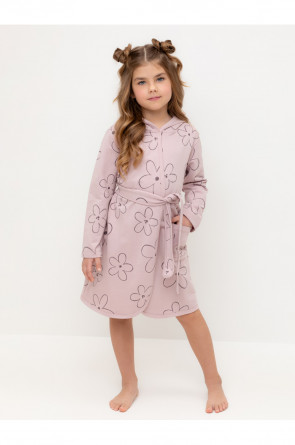 Халат с тонким капюшоном. Изготовлен из набивного хлопкового трикотажа футер петля. С помощью пояса можно регулировать посадку по фигуре. Сверху застёжка на кнопку. Края изделия обработаны мягким кантом. На боку накладной карман, уходящий в шов. Оригинальная набивка выполнена из стойких гипоаллергенных текстильных красителей. Все трикотажные полотна производятся в соответствии с нормами швейцарского сертификата ЭкоТекс.