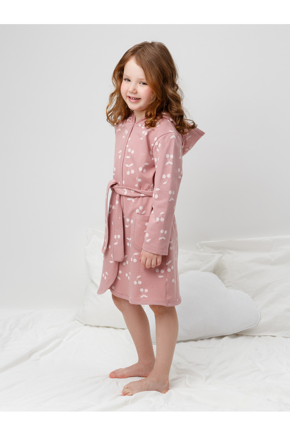 Халат с тонким капюшоном. Изготовлен из набивного хлопкового трикотажа футер петля. С помощью пояса можно регулировать посадку по фигуре. Сверху застёжка на кнопку. Края изделия обработаны мягким кантом. На боку накладной карман, уходящий в шов. Оригинальная набивка выполнена из стойких гипоаллергенных текстильных красителей. Все трикотажные полотна производятся в соответствии с нормами швейцарского сертификата ЭкоТекс.