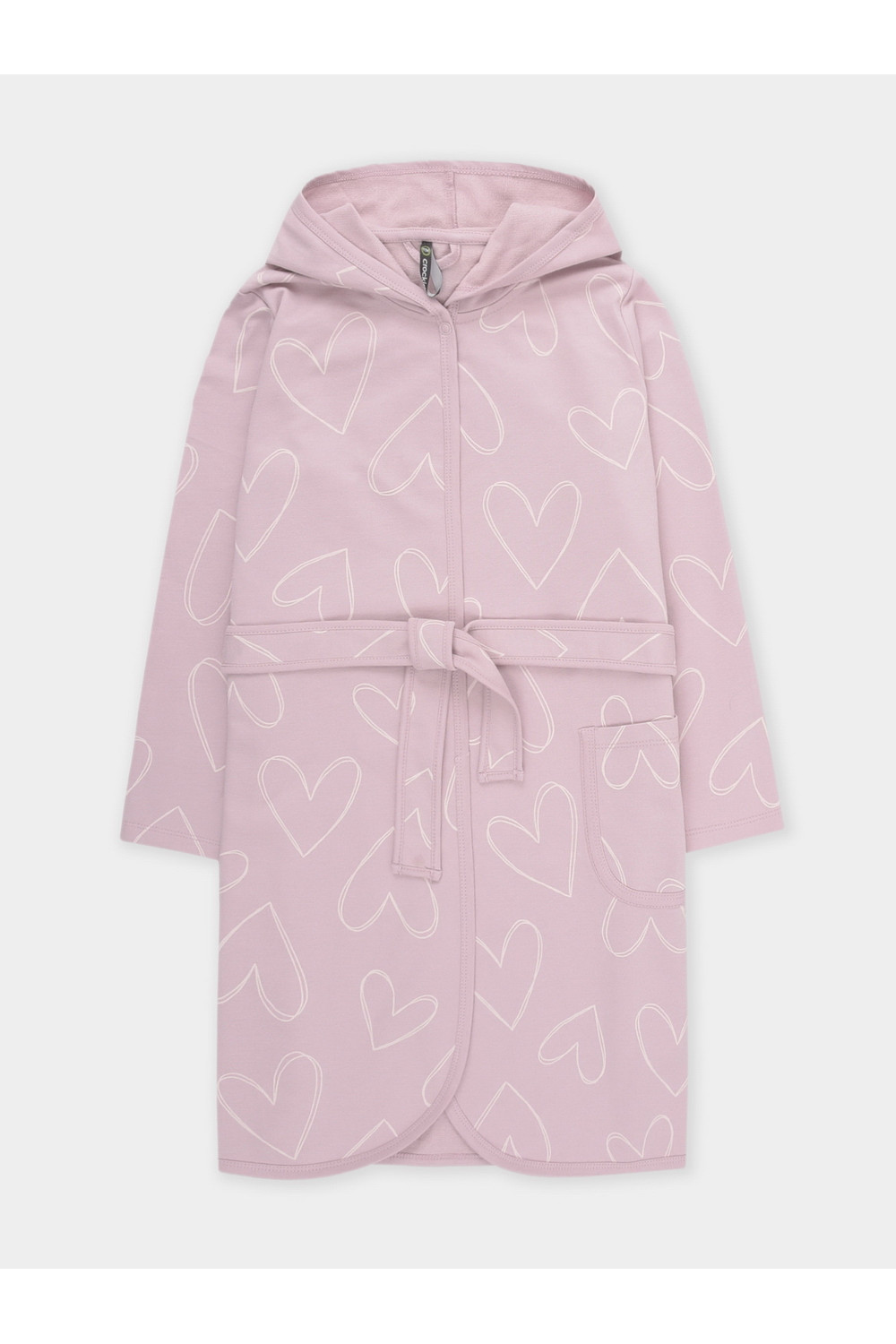 Халат с тонким капюшоном. Изготовлен из набивного хлопкового трикотажа футер петля. С помощью пояса можно регулировать посадку по фигуре. Сверху застёжка на кнопку. Края изделия обработаны мягким кантом. На боку накладной карман, уходящий в шов. Оригинальная набивка выполнена из стойких гипоаллергенных текстильных красителей. Все трикотажные полотна производятся в соответствии с нормами швейцарского сертификата ЭкоТекс.