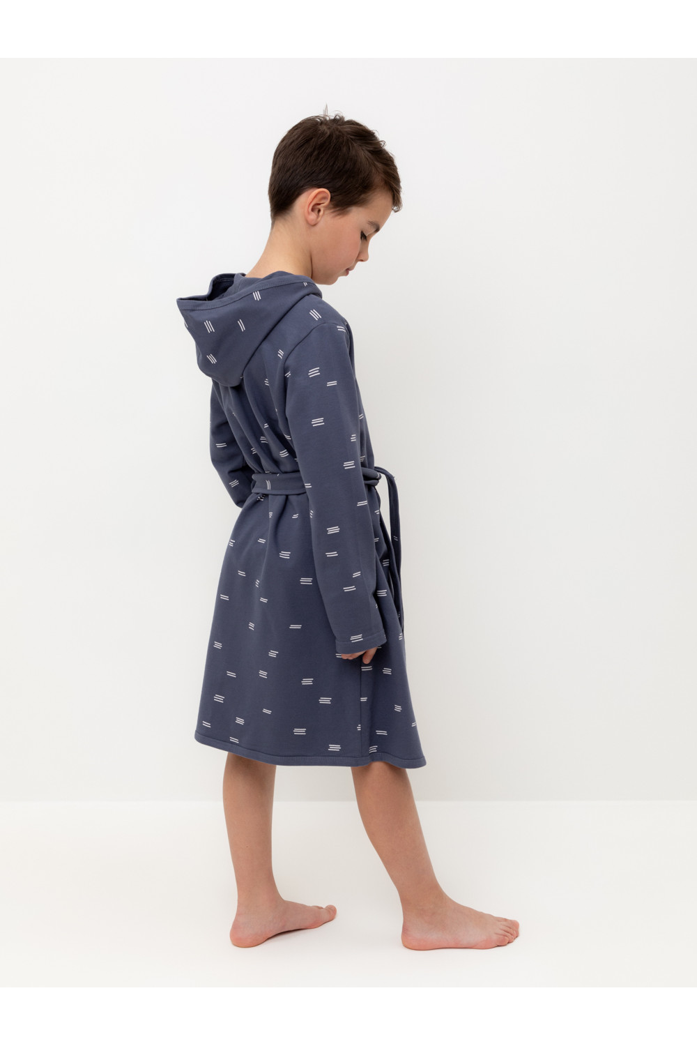 Халат с тонким капюшоном. Изготовлен из набивного хлопкового трикотажа футер петля. С помощью пояса можно регулировать посадку по фигуре. Сверху застёжка на кнопку. Края изделия обработаны мягким кантом. На боку накладной карман, уходящий в шов. Оригинальная набивка выполнена из стойких гипоаллергенных текстильных красителей. Все трикотажные полотна производятся в соответствии с нормами швейцарского сертификата ЭкоТекс.