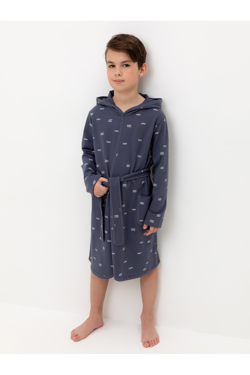 Халат с тонким капюшоном. Изготовлен из набивного хлопкового трикотажа футер петля. С помощью пояса можно регулировать посадку по фигуре. Сверху застёжка на кнопку. Края изделия обработаны мягким кантом. На боку накладной карман, уходящий в шов. Оригинальная набивка выполнена из стойких гипоаллергенных текстильных красителей. Все трикотажные полотна производятся в соответствии с нормами швейцарского сертификата ЭкоТекс.