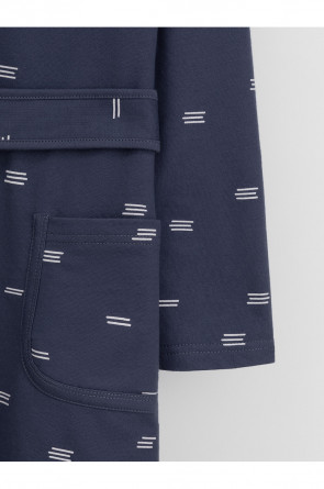 Халат с тонким капюшоном. Изготовлен из набивного хлопкового трикотажа футер петля. С помощью пояса можно регулировать посадку по фигуре. Сверху застёжка на кнопку. Края изделия обработаны мягким кантом. На боку накладной карман, уходящий в шов. Оригинальная набивка выполнена из стойких гипоаллергенных текстильных красителей. Все трикотажные полотна производятся в соответствии с нормами швейцарского сертификата ЭкоТекс.