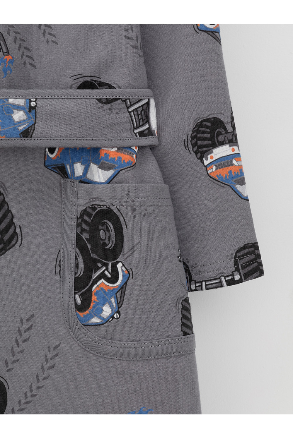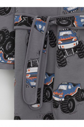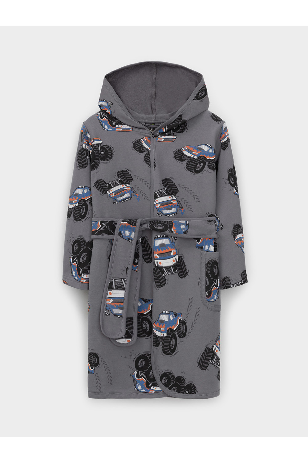 Халат с тонким капюшоном. Изготовлен из набивного хлопкового трикотажа футер петля. С помощью пояса можно регулировать посадку по фигуре. Сверху застёжка на кнопку. Края изделия обработаны мягким кантом. На боку накладной карман, уходящий в шов. Оригинальная набивка выполнена из стойких гипоаллергенных текстильных красителей. Все трикотажные полотна производятся в соответствии с нормами швейцарского сертификата ЭкоТекс.
