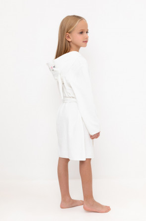 Однотонный махровый халат для девочки на запахе без начёса. Капюшон с мягким подкладом украшен аппликацией с изображением зайчика и объёмными ушками. Пояс продет в петли. На груди дополнительная застёжка на две кнопки. По бокам удобные карманы. Рукава и края изделия обработаны кантом.