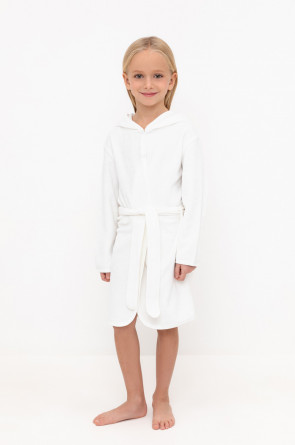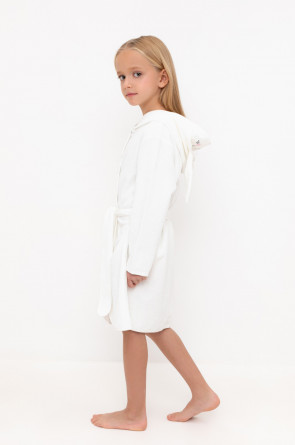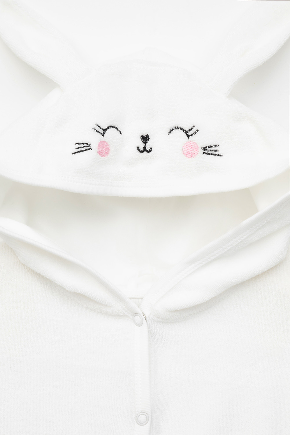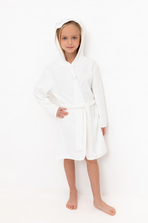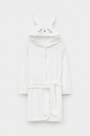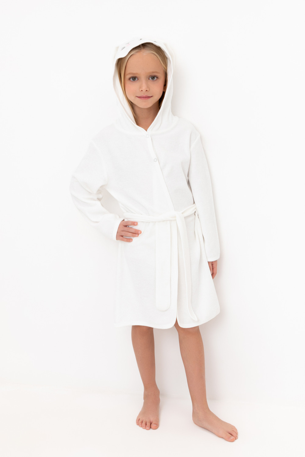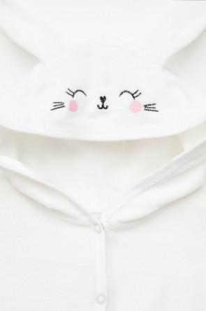 Однотонный махровый халат для девочки на запахе без начёса. Капюшон с мягким подкладом украшен аппликацией с изображением зайчика и объёмными ушками. Пояс продет в петли. На груди дополнительная застёжка на две кнопки. По бокам удобные карманы. Рукава и края изделия обработаны кантом.