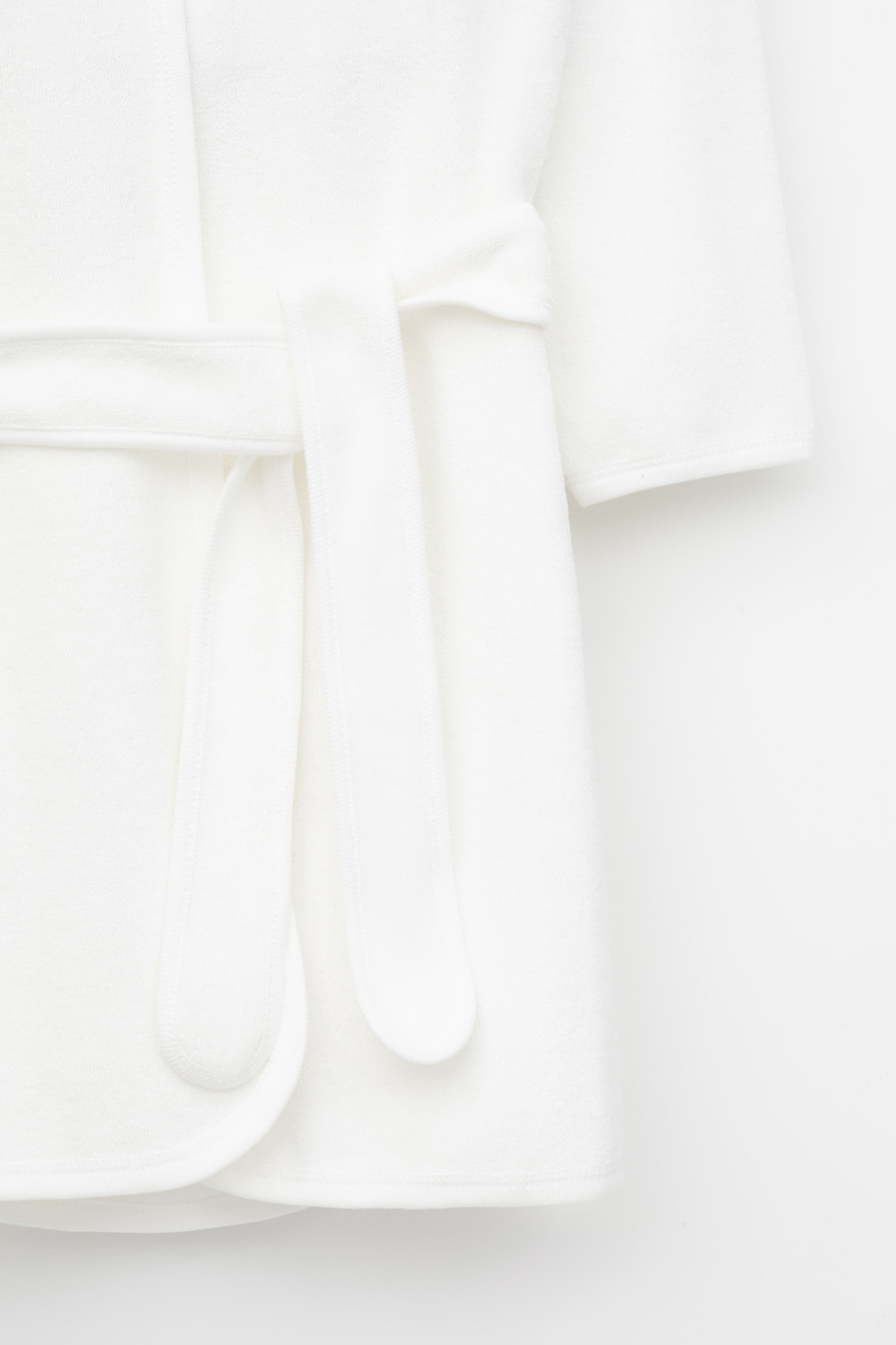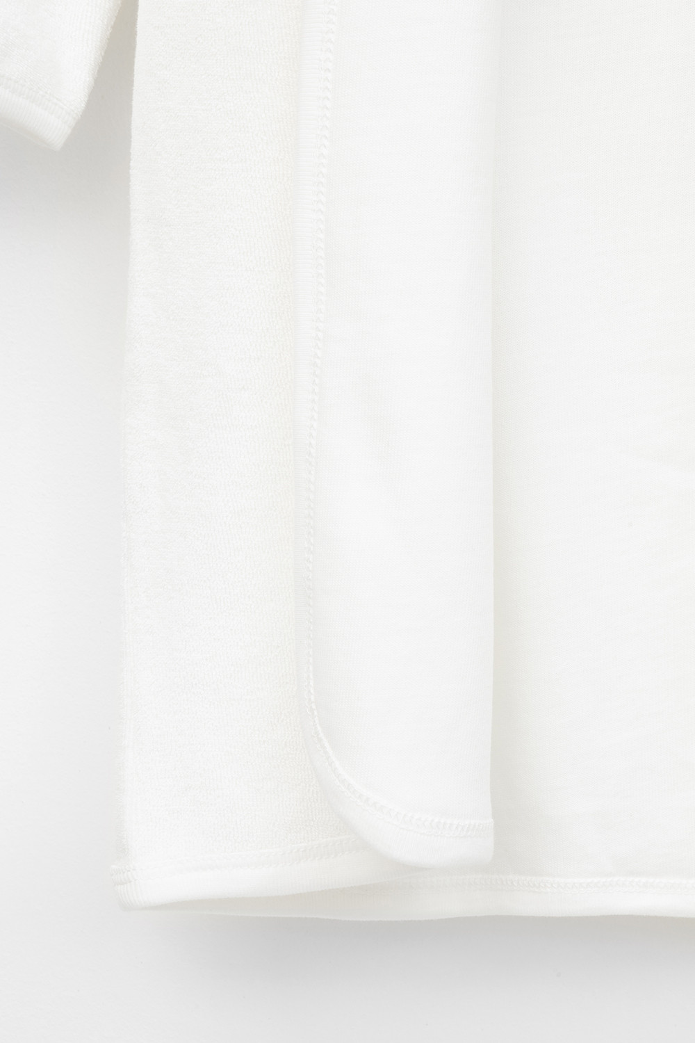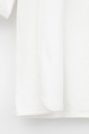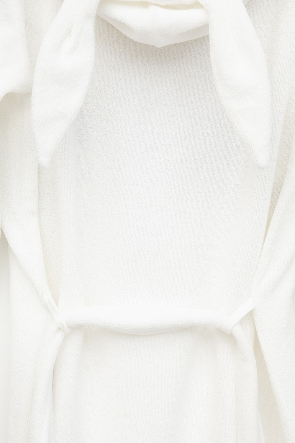 Однотонный махровый халат для девочки на запахе без начёса. Капюшон с мягким подкладом украшен аппликацией с изображением зайчика и объёмными ушками. Пояс продет в петли. На груди дополнительная застёжка на две кнопки. По бокам удобные карманы. Рукава и края изделия обработаны кантом.