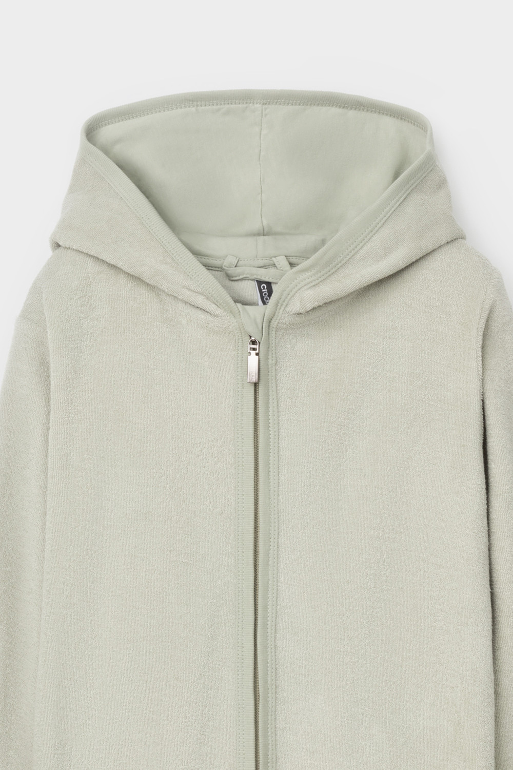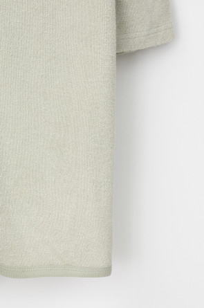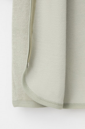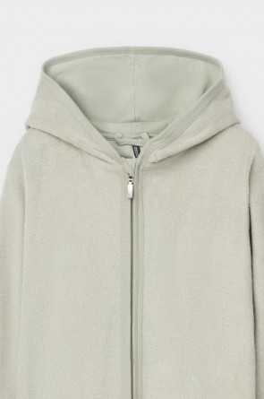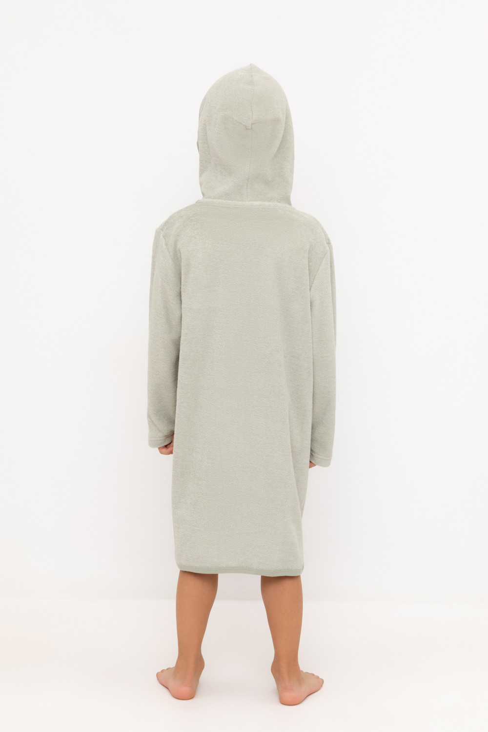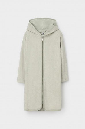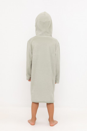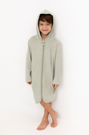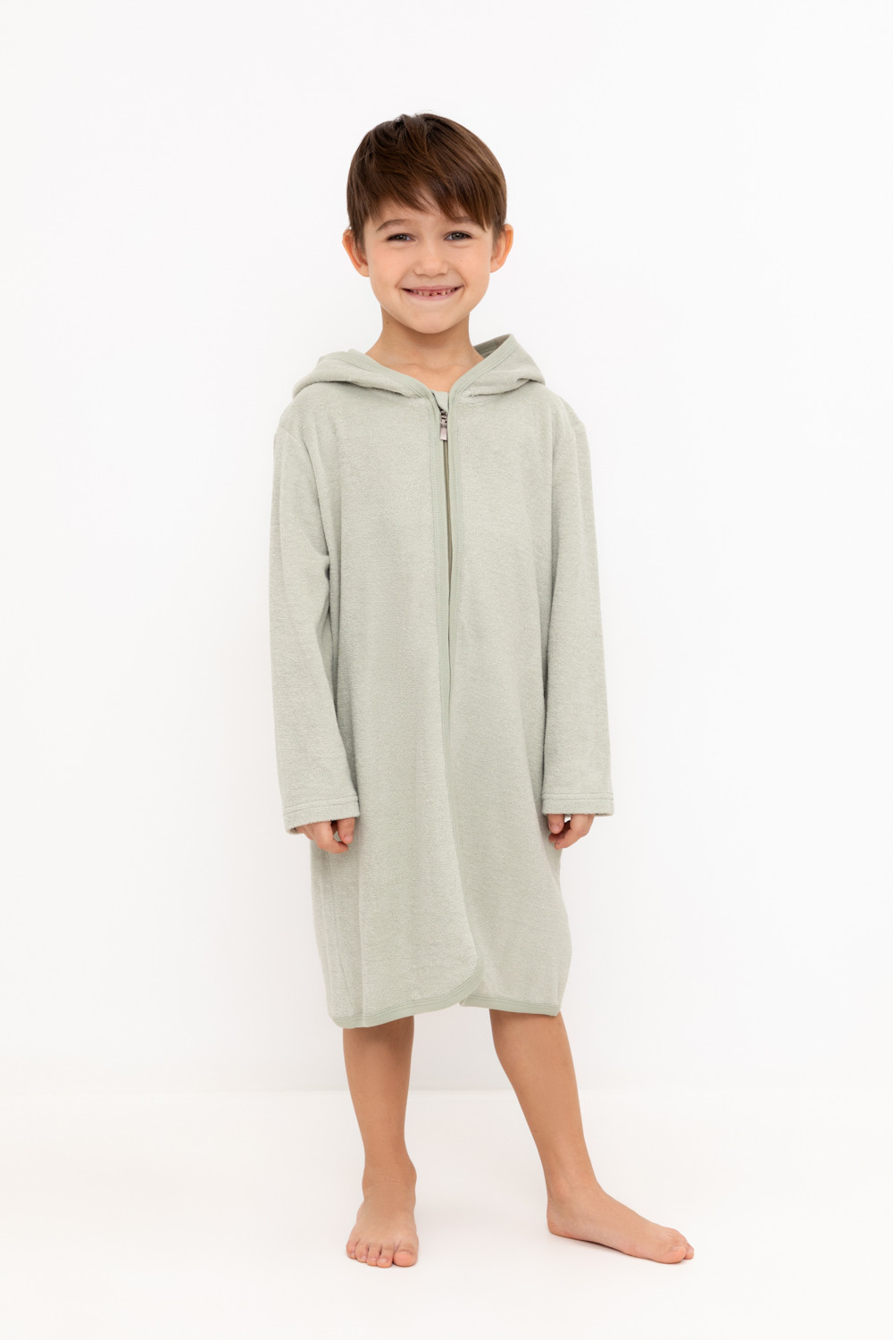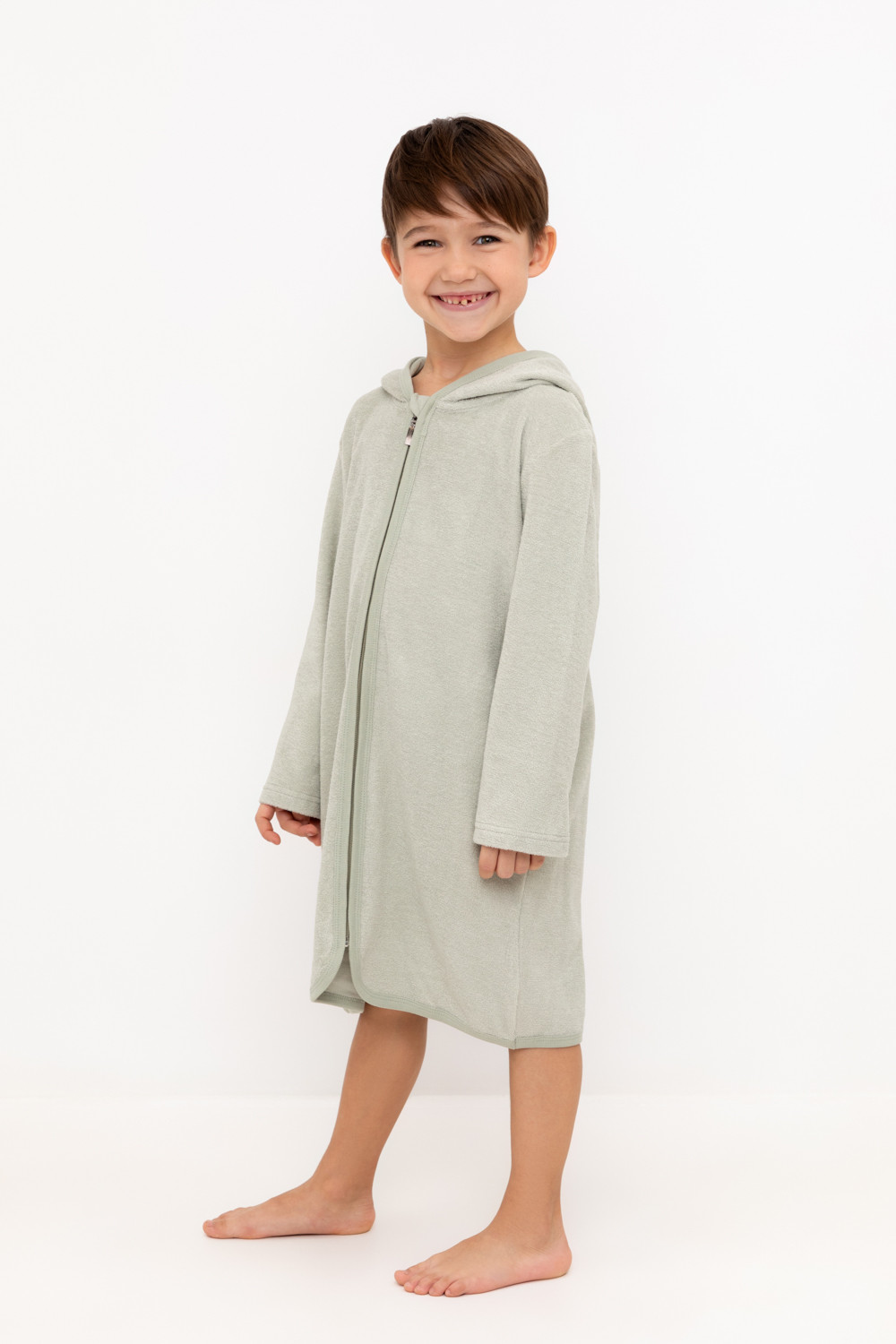 Однотонный махровый халат для мальчика на молнии без начёса. Капюшон с мягким подкладом. В боковых швах удобные карманы. Рукава и края изделия обработаны кантом.