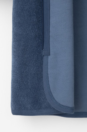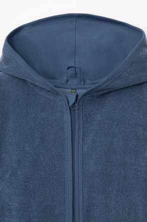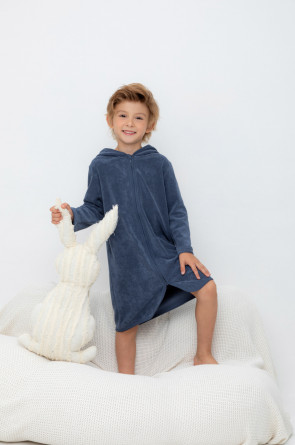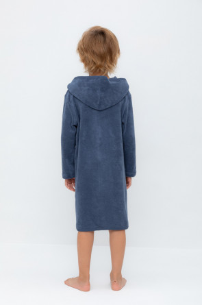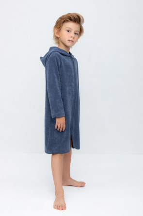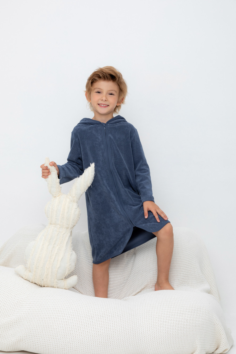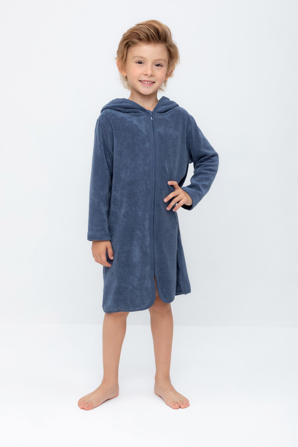 Однотонный махровый халат для мальчика на молнии без начёса. Капюшон с мягким подкладом. В боковых швах удобные карманы. Рукава и края изделия обработаны кантом.