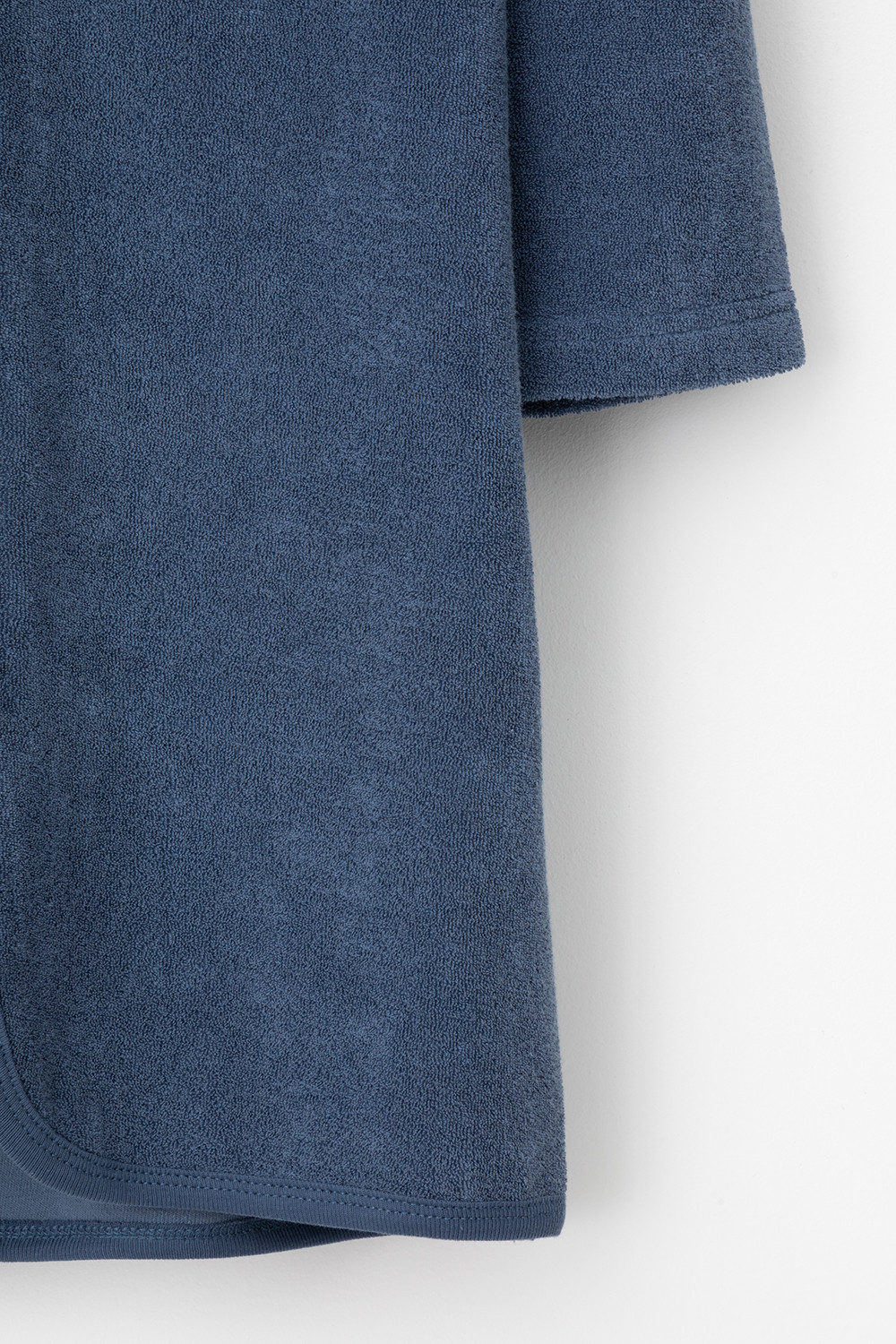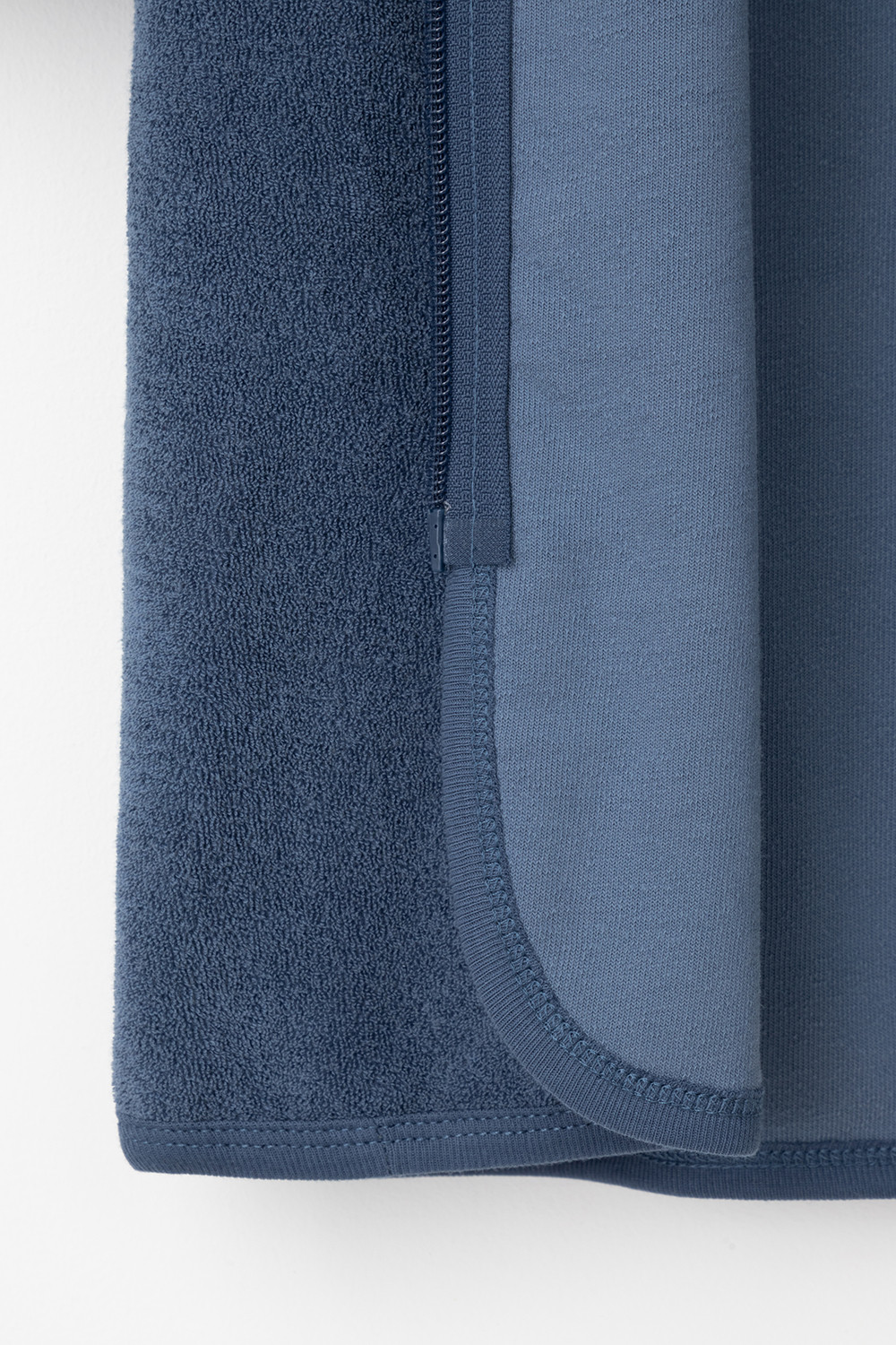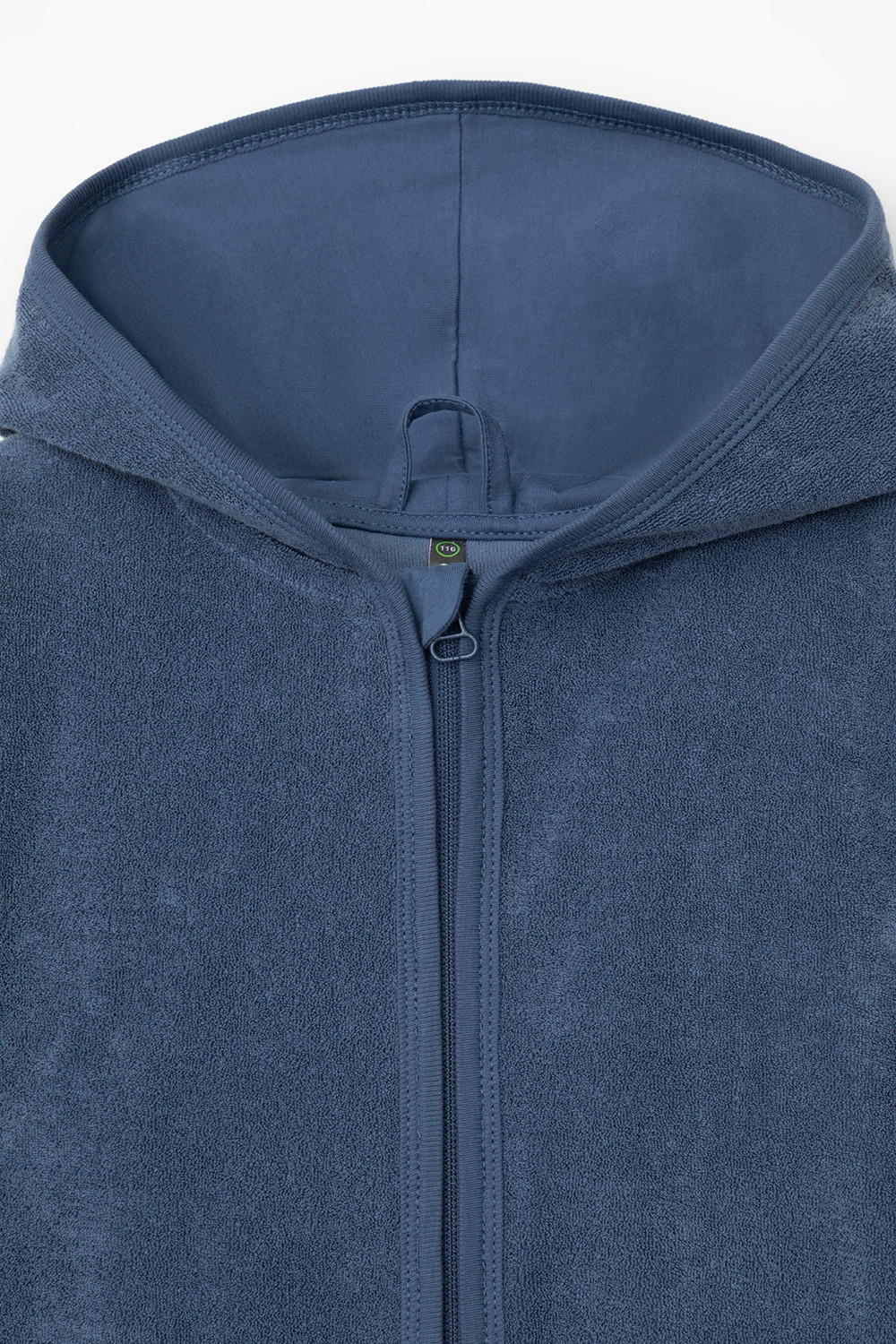 Однотонный махровый халат для мальчика на молнии без начёса. Капюшон с мягким подкладом. В боковых швах удобные карманы. Рукава и края изделия обработаны кантом.