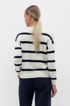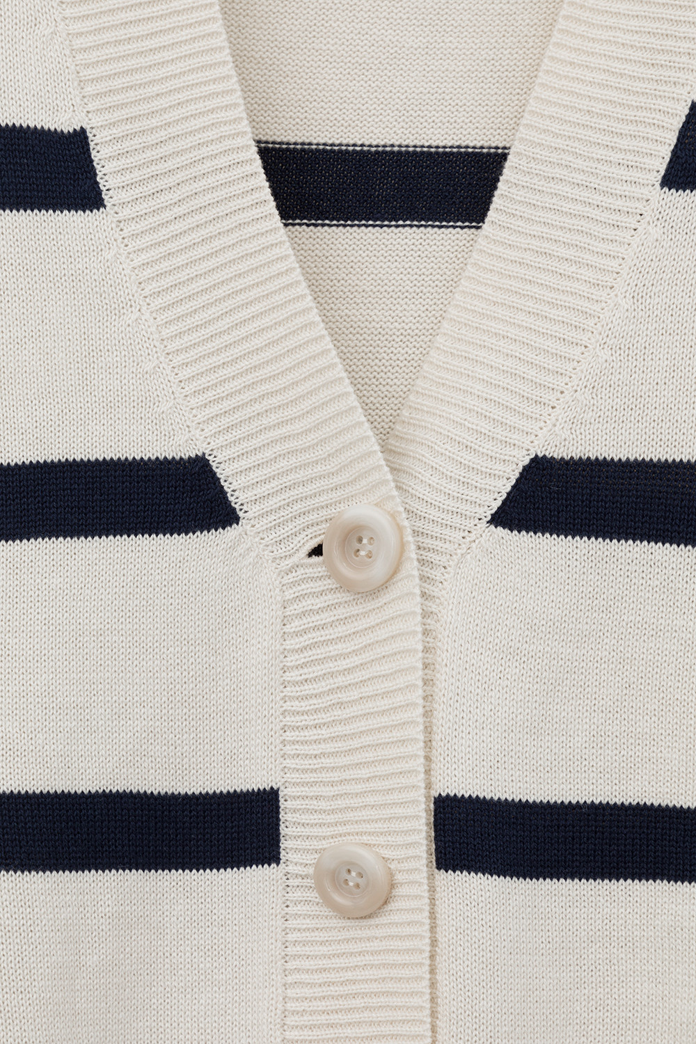 Вязаный кардиган в полоску на пуговицах из хлопка с добавлением акрила. Фактурная вязка сохраняет форму, а манжеты и нижний край изделия не растянутся благодаря вывязанной резинке.