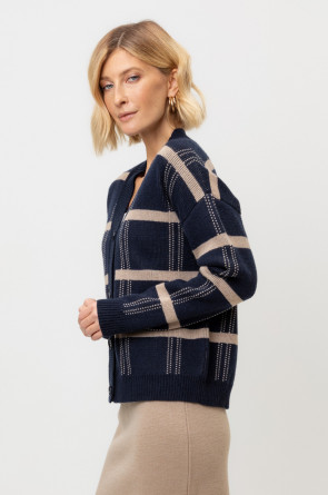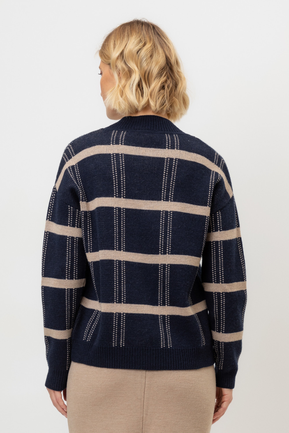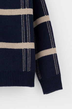 Выполнен из мягкой полушерстяной пряжи. Шерсть мериноса в составе сохраняет тепло, акрил делает изделие мягким. Прямой силуэт идеально подходит как к юбке, так и к брюкам.