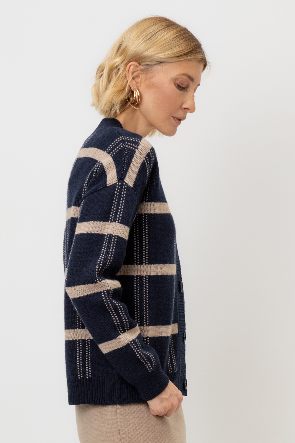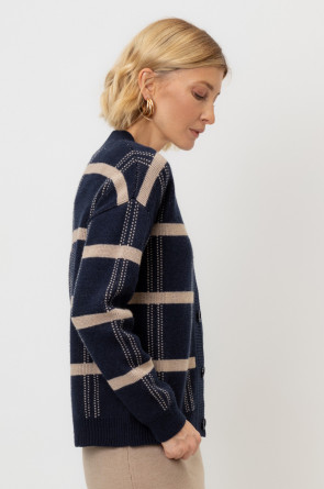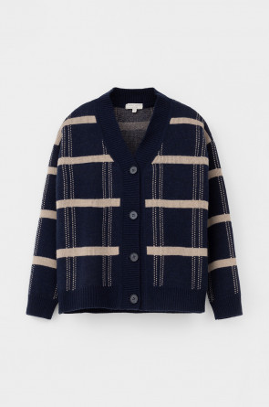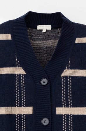 Вязаный кардиган на пуговицах из шерсти с добавлением акрила. Связан жаккардом, а манжеты и нижний край не растянутся благодаря вывязанной резинке.