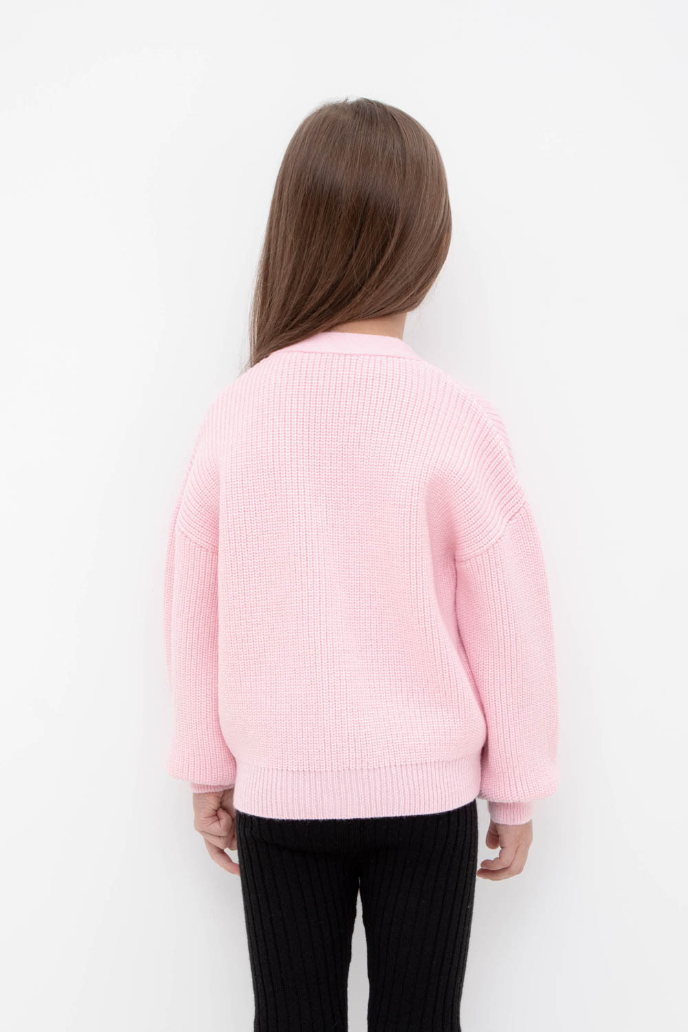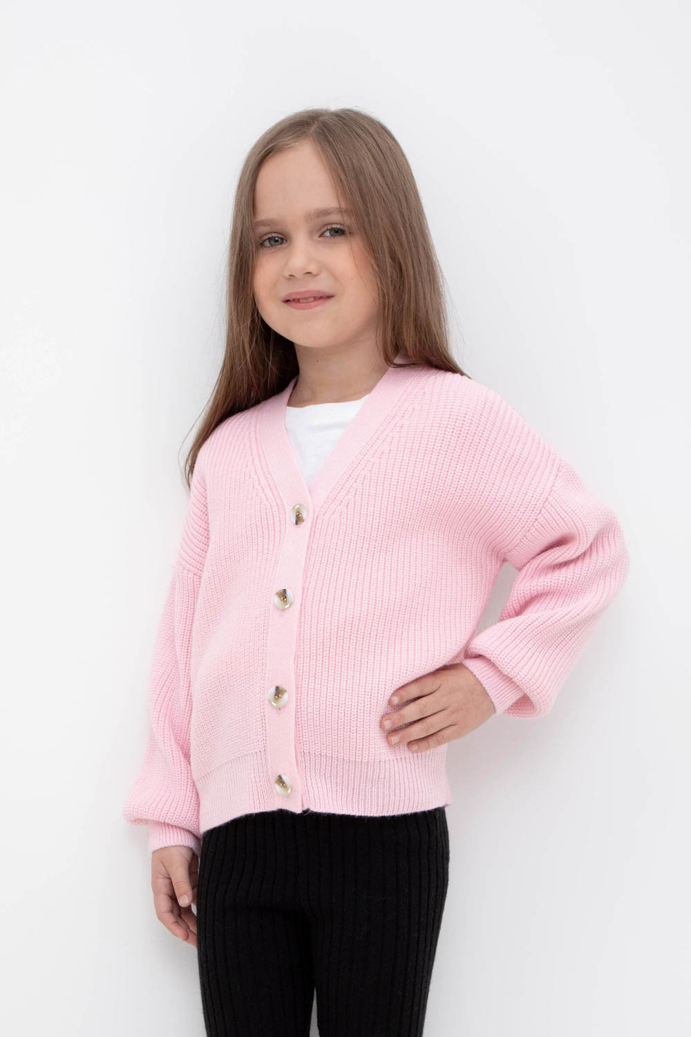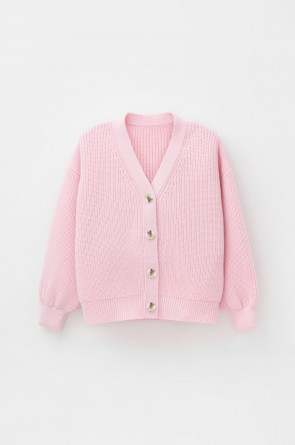 Вязаный кардиган для девочки из мягкой полушерстяной пряжи. Застёгивается на пуговицы. Длинные рукава с манжетами. Внизу эластичный пояс. Изделие сохраняет форму и стойкий цвет после многочисленных стирок.