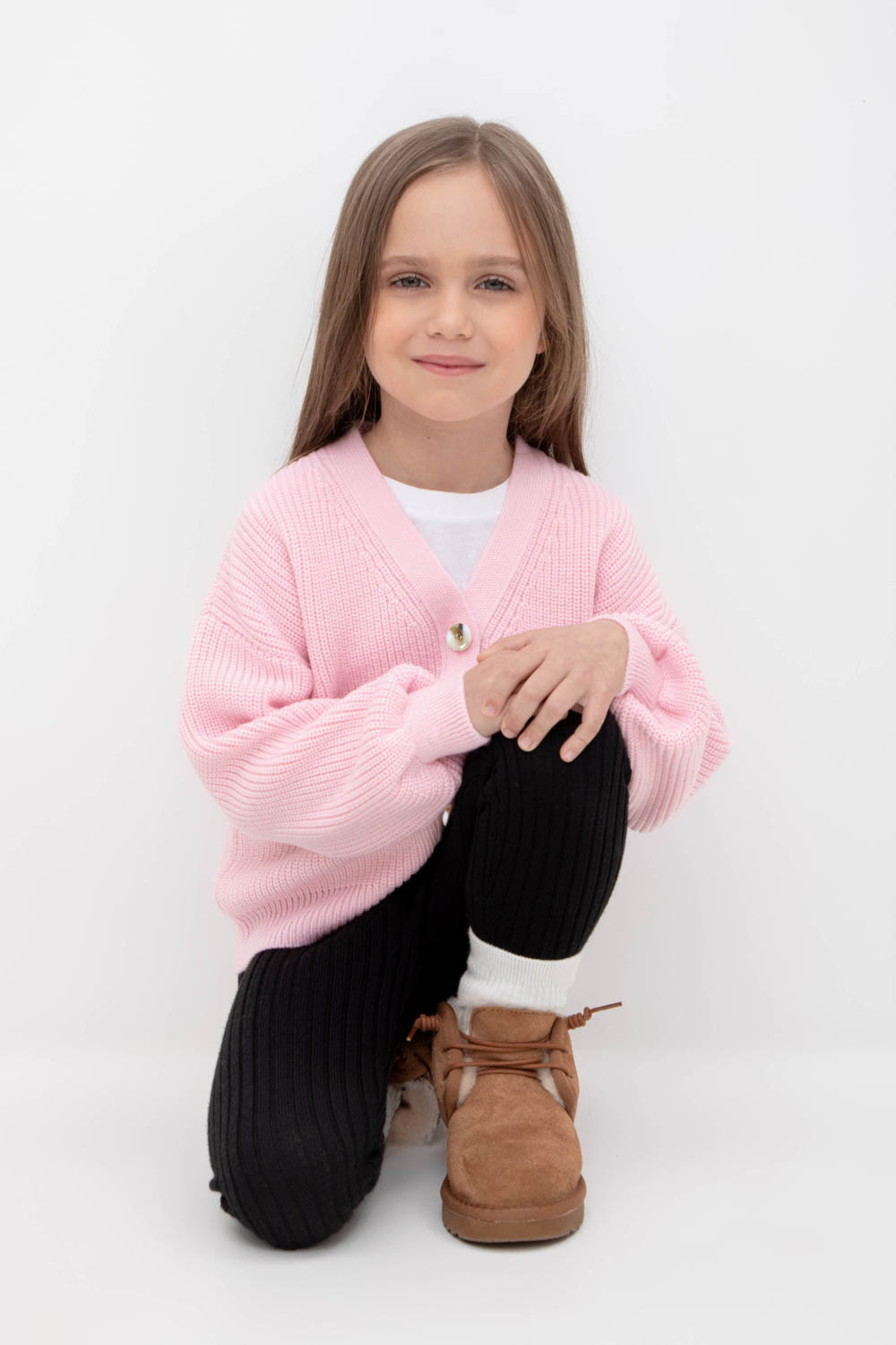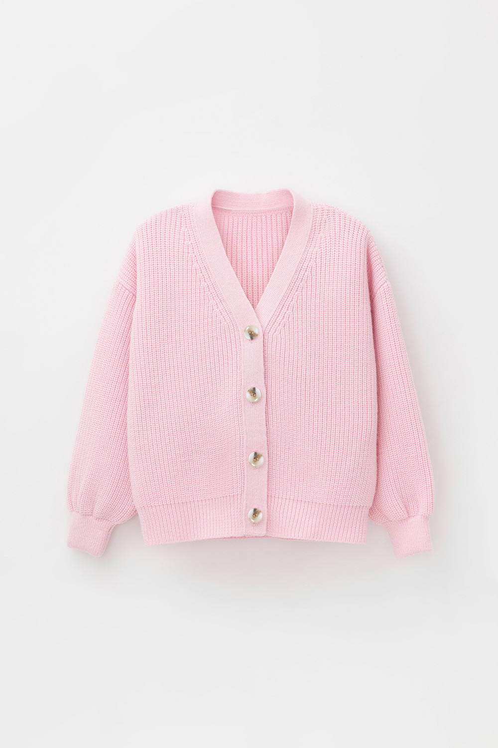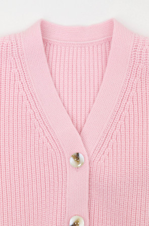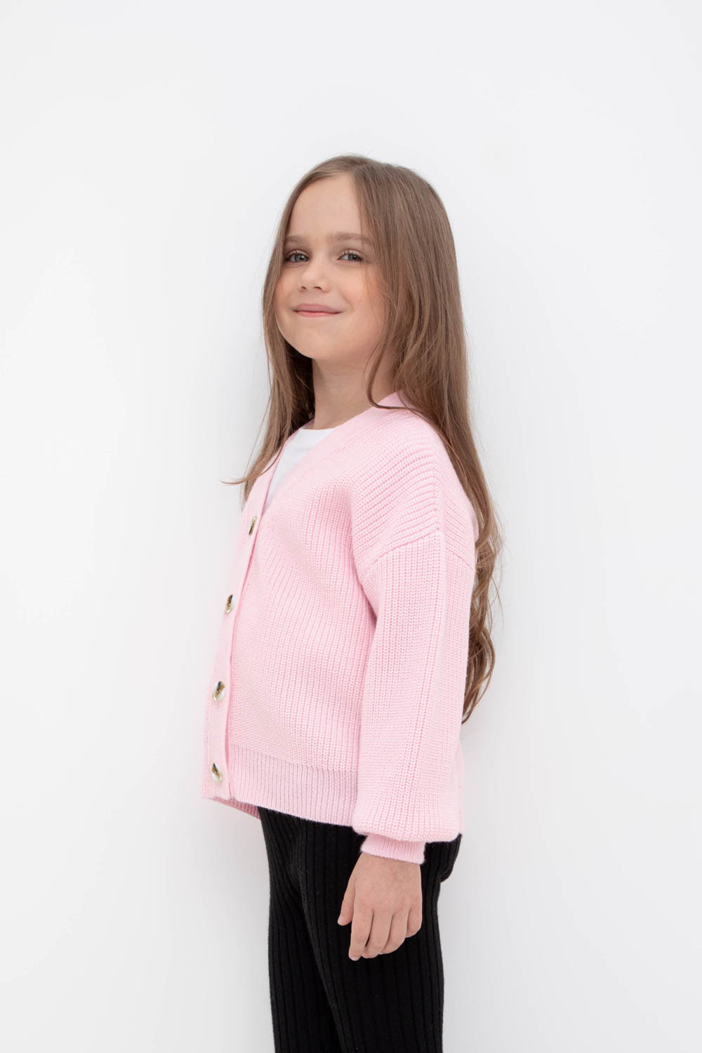 Вязаный кардиган для девочки из мягкой полушерстяной пряжи. Застёгивается на пуговицы. Длинные рукава с манжетами. Внизу эластичный пояс. Изделие сохраняет форму и стойкий цвет после многочисленных стирок.