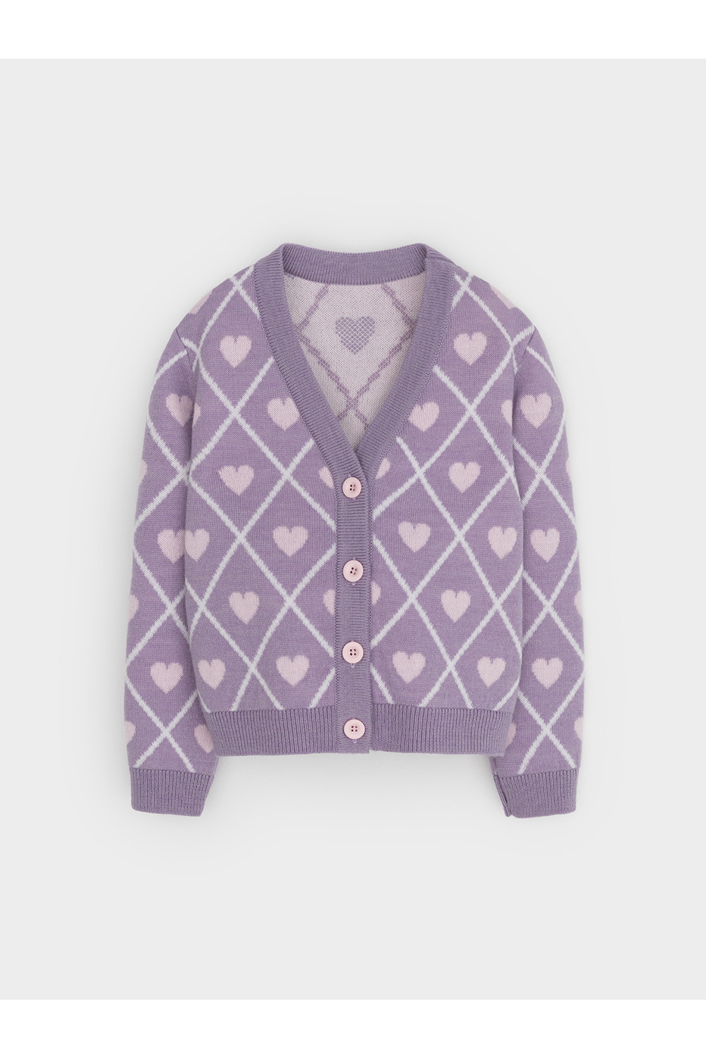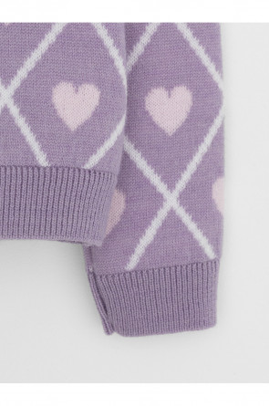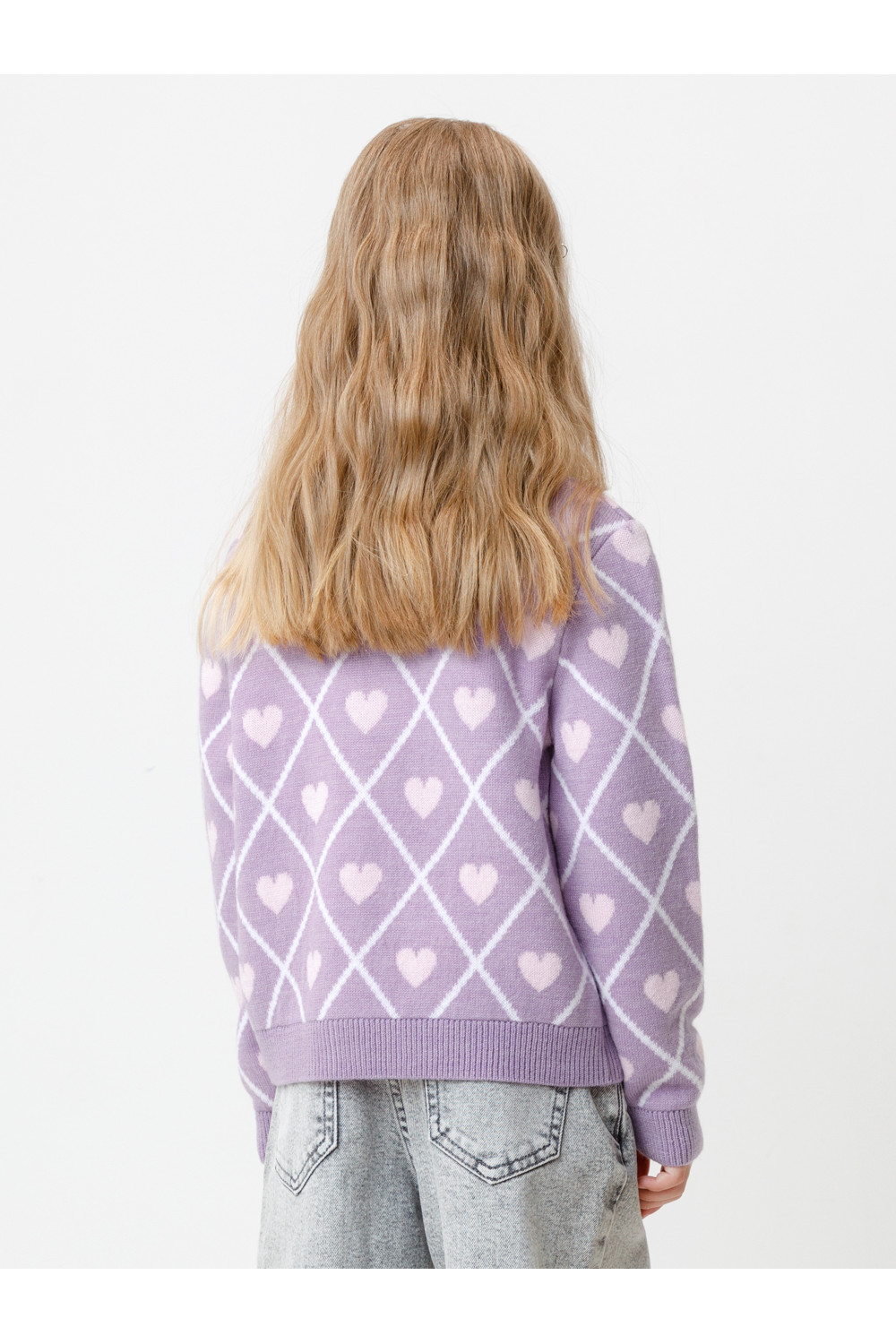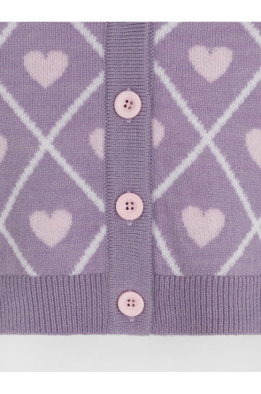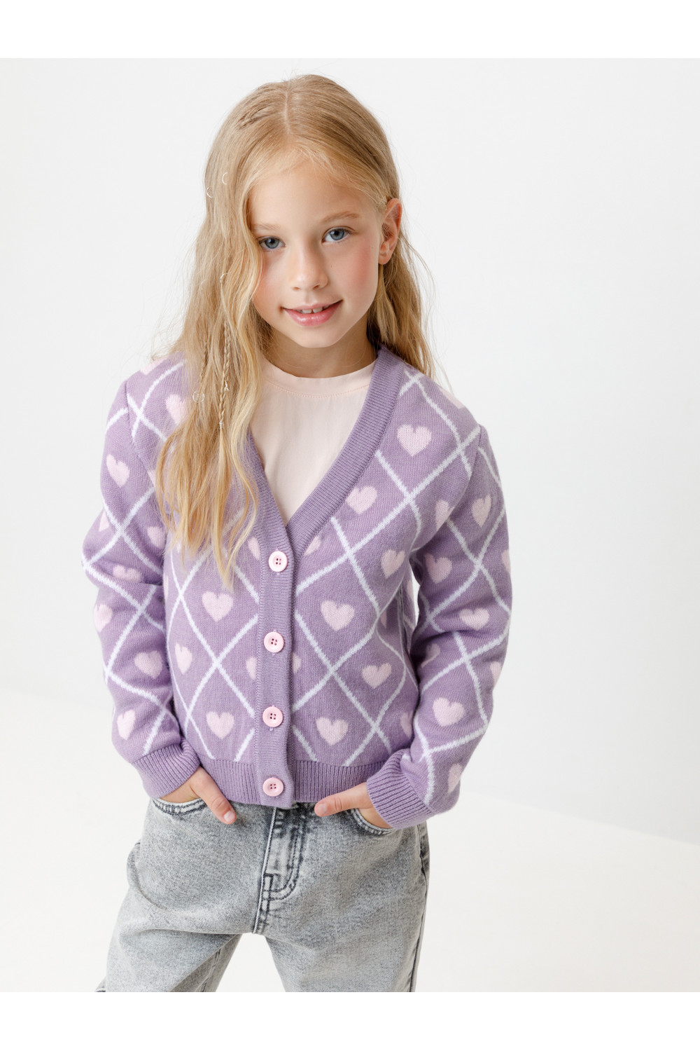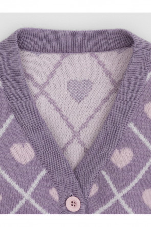 Вязаный кардиган с сердечками для девочки. Изготовлен из мягкой полушерстяной пряжи. Застёгивается на планку с пуговицами. Длинные рукава с манжетами. Внизу эластичный пояс. Изделие сохраняет форму и стойкий цвет после многочисленных стирок.