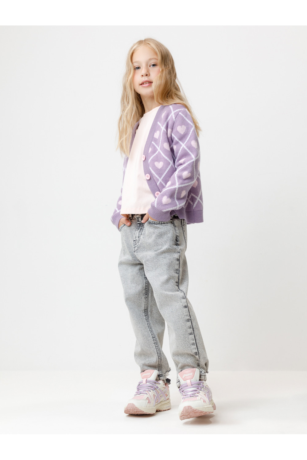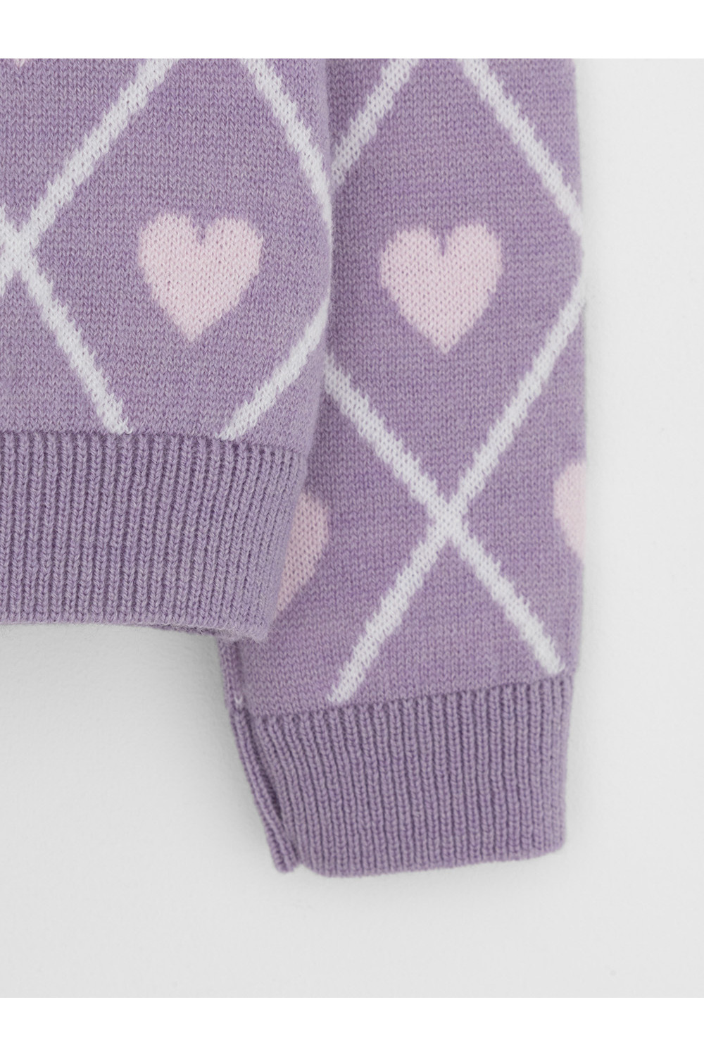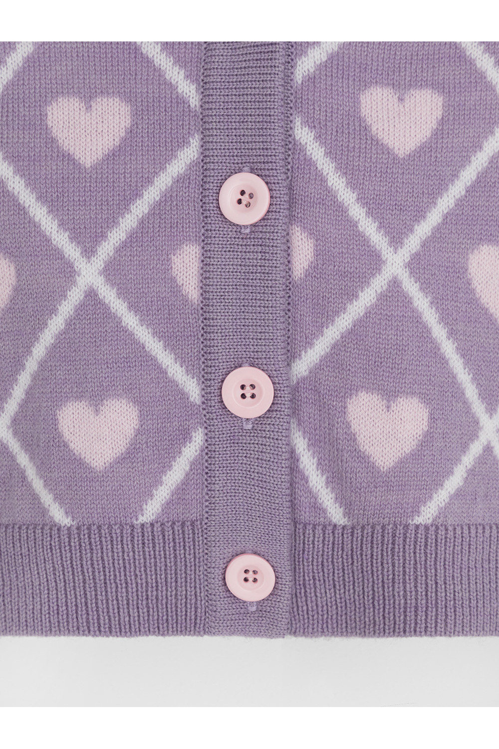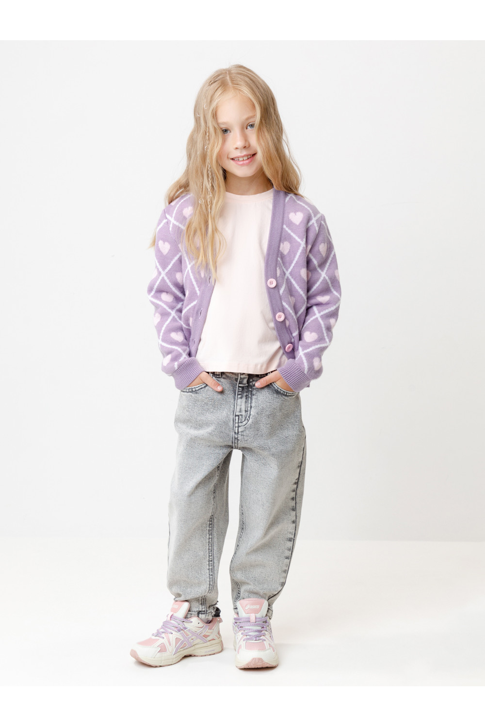 Вязаный кардиган с сердечками для девочки. Изготовлен из мягкой полушерстяной пряжи. Застёгивается на планку с пуговицами. Длинные рукава с манжетами. Внизу эластичный пояс. Изделие сохраняет форму и стойкий цвет после многочисленных стирок.