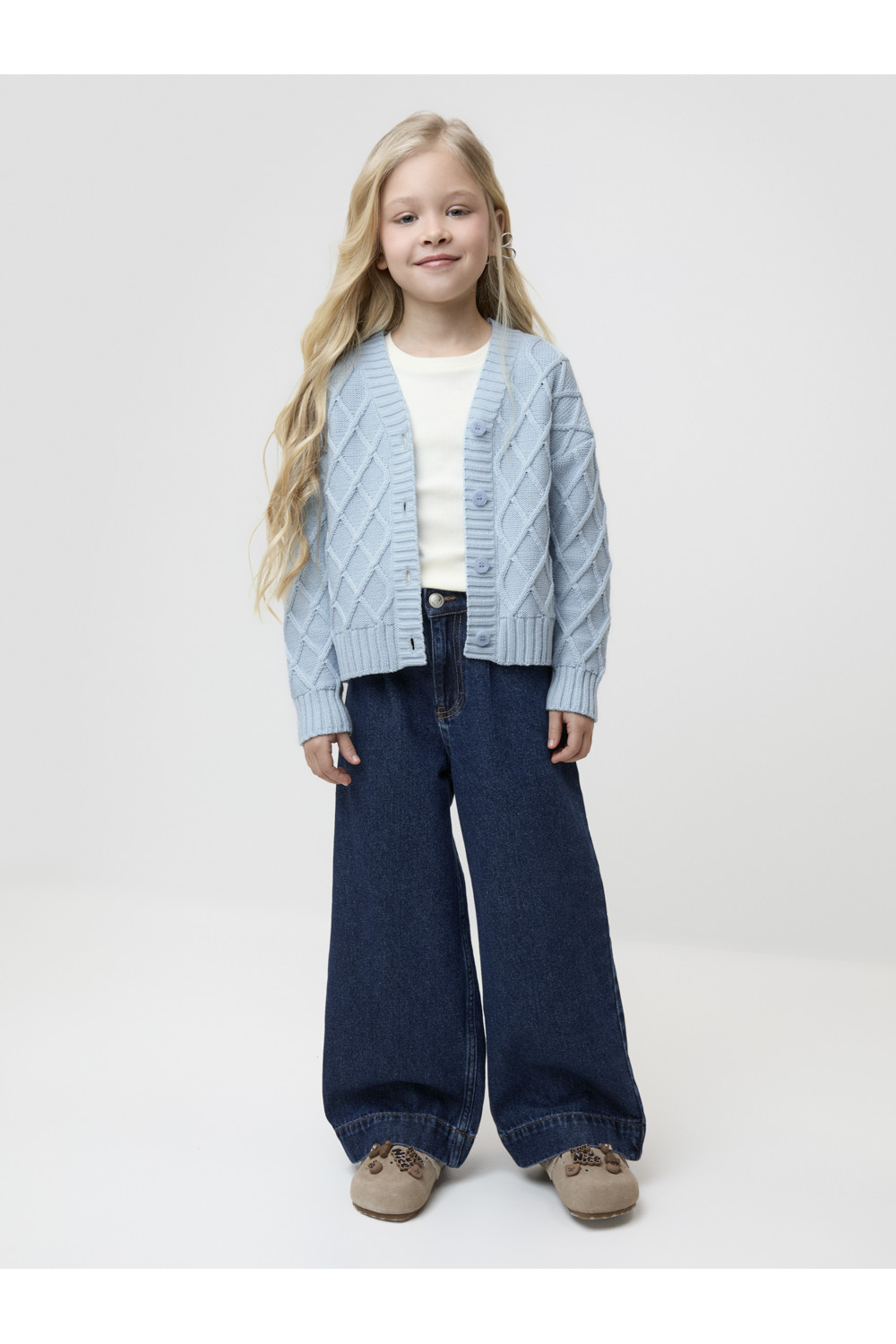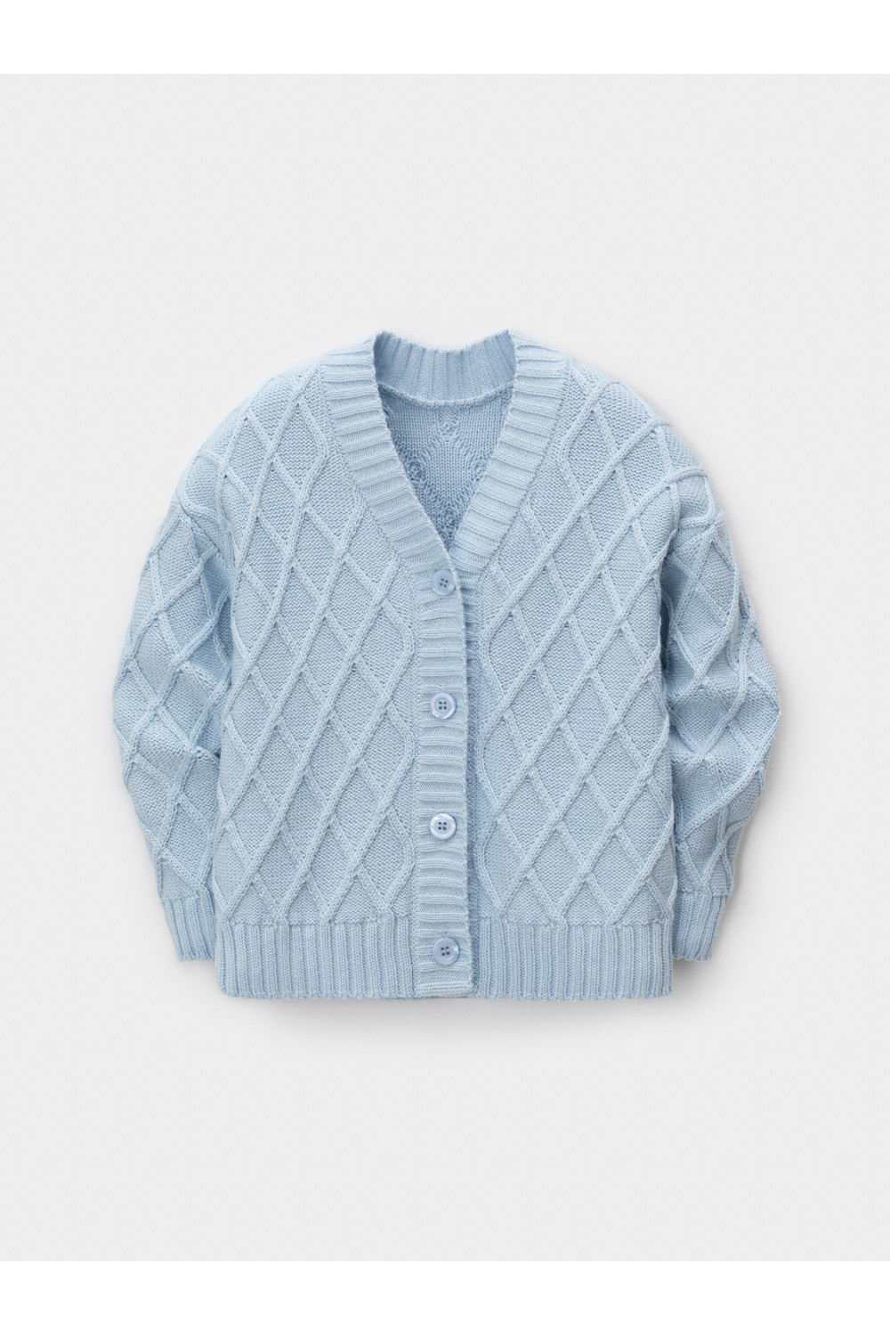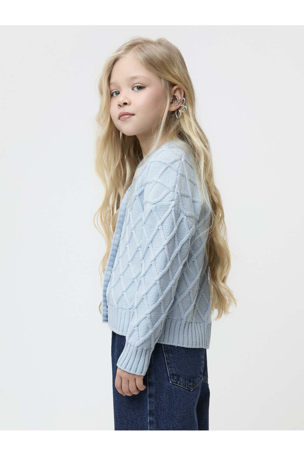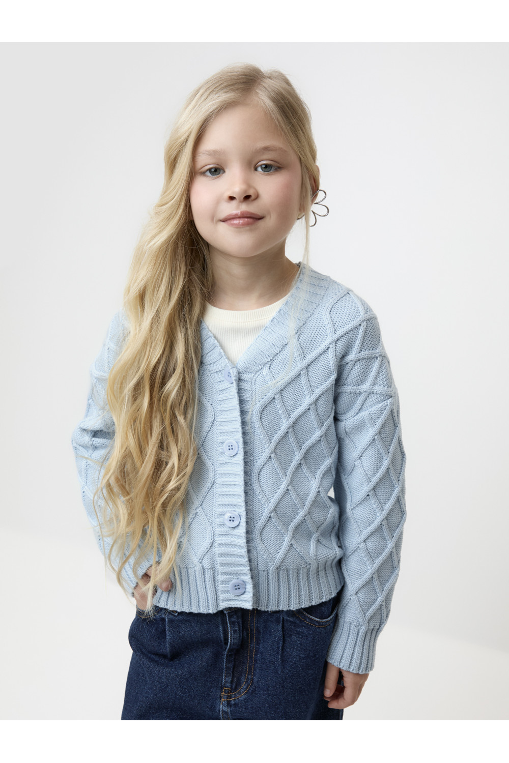 Вязаный кардиган для девочки. Изготовлен из мягкой хлопковой пряжи с добавлением акрила. Застёгивается на планку с пуговицами. Длинные рукава с манжетами. Внизу эластичный пояс. Изделие сохраняет форму и стойкий цвет после многочисленных стирок.