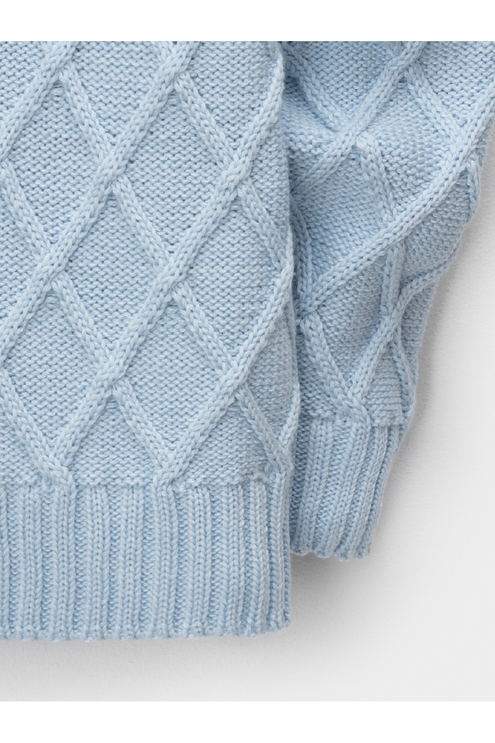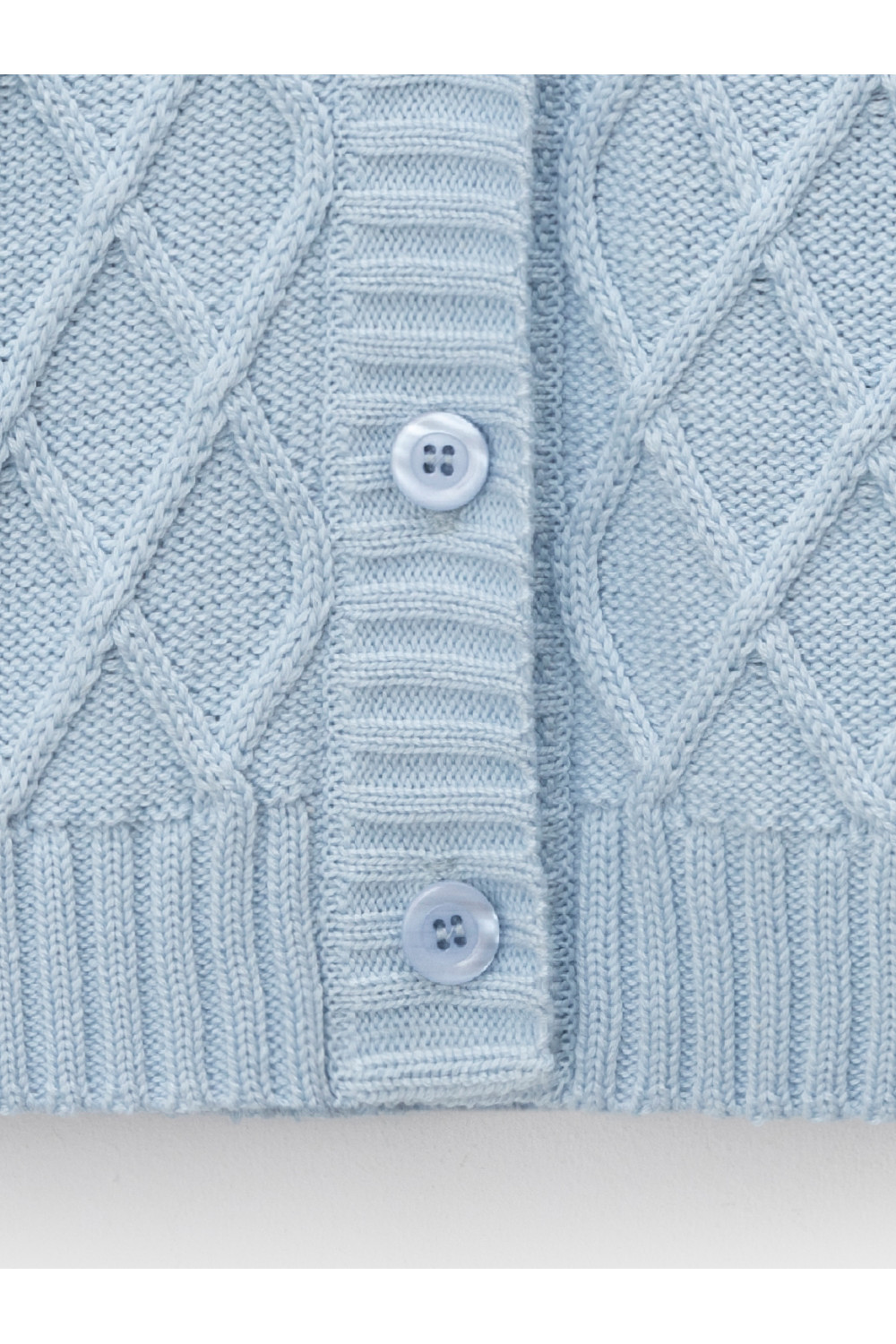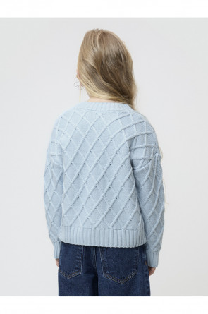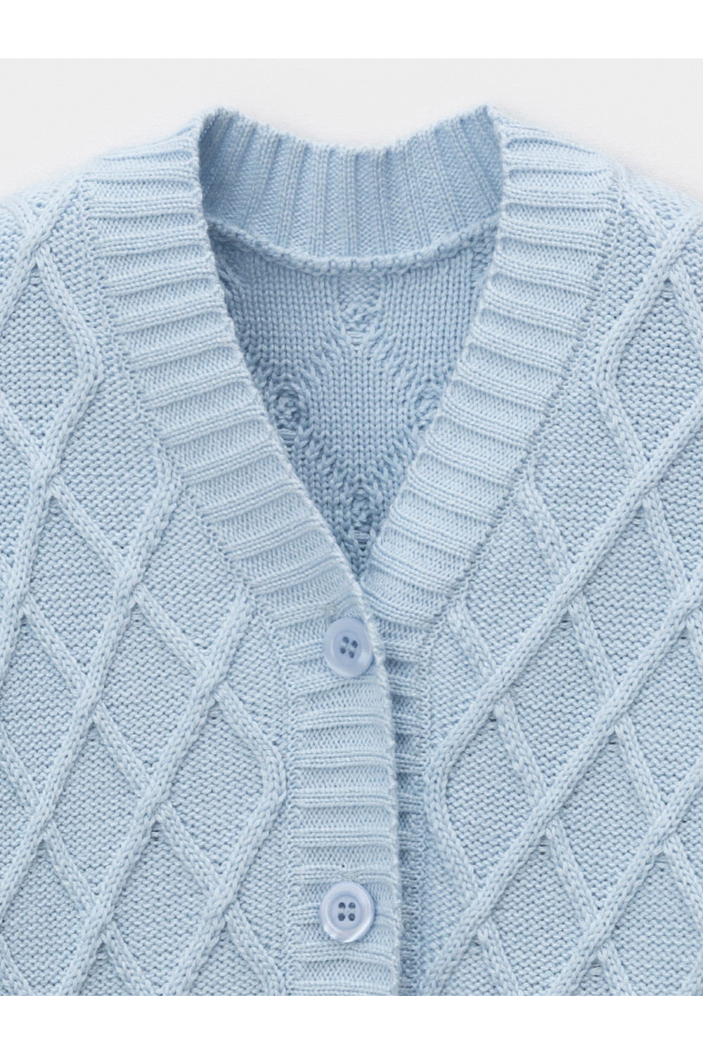 Вязаный кардиган для девочки. Изготовлен из мягкой хлопковой пряжи с добавлением акрила. Застёгивается на планку с пуговицами. Длинные рукава с манжетами. Внизу эластичный пояс. Изделие сохраняет форму и стойкий цвет после многочисленных стирок.