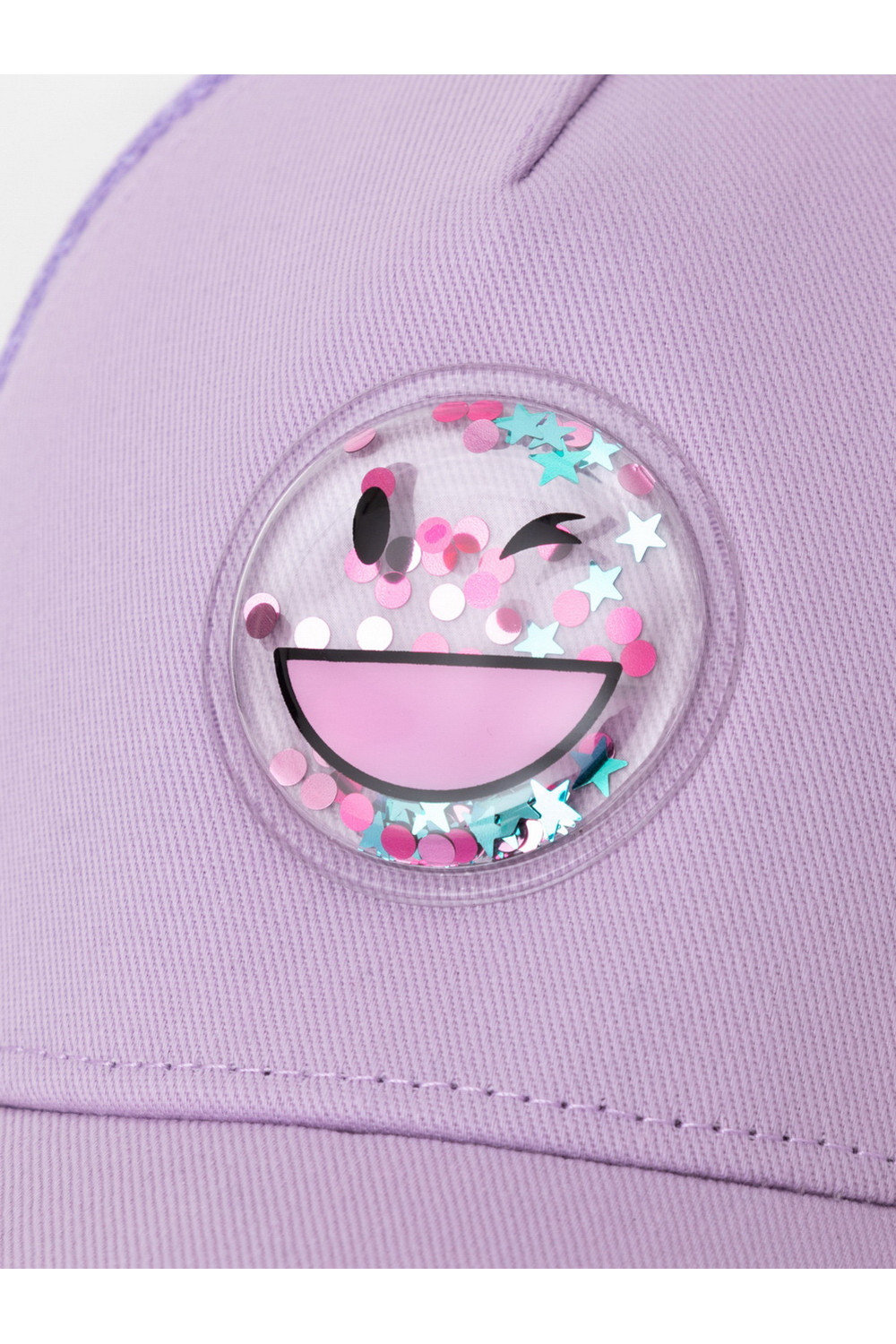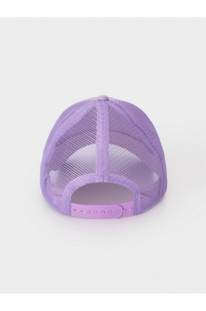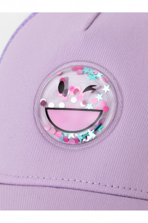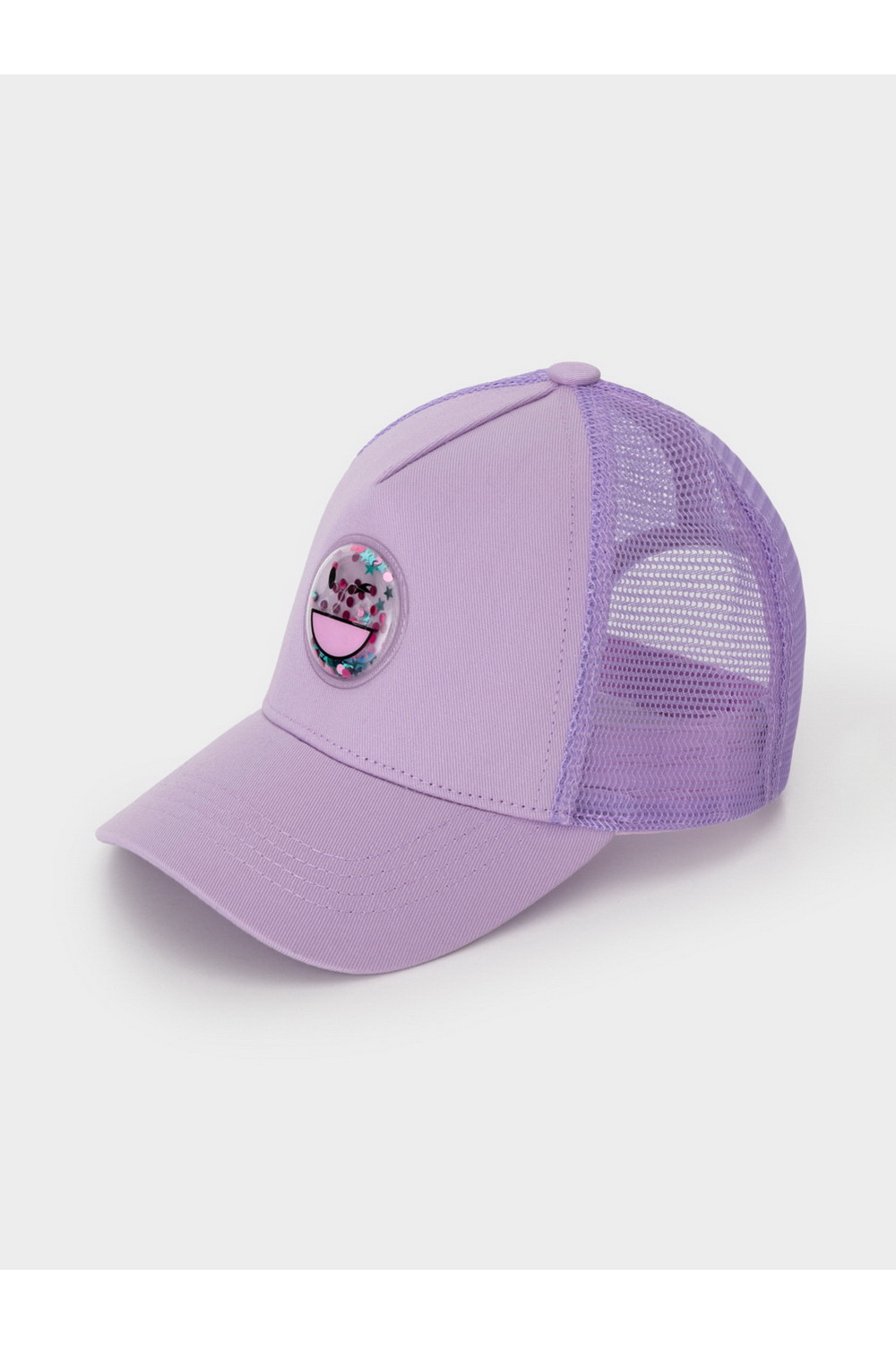 Кепка для девочки из текстиля и сетки. Спереди украшена оригинальной нашивкой с блёстками. Регулируется по ширине головы и фиксируется на затылке с помощью пластиковой застёжки.