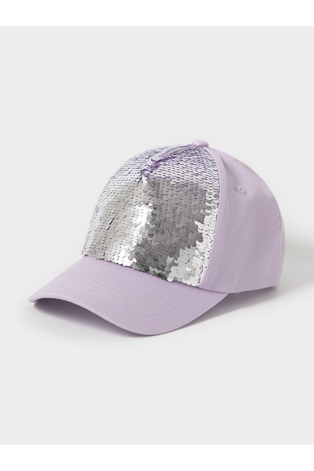 Кепка для девочки из натурального хлопка. Спереди украшена пайетками. Регулируется по ширине головы и фиксируется на затылке с помощью металлического зажима.