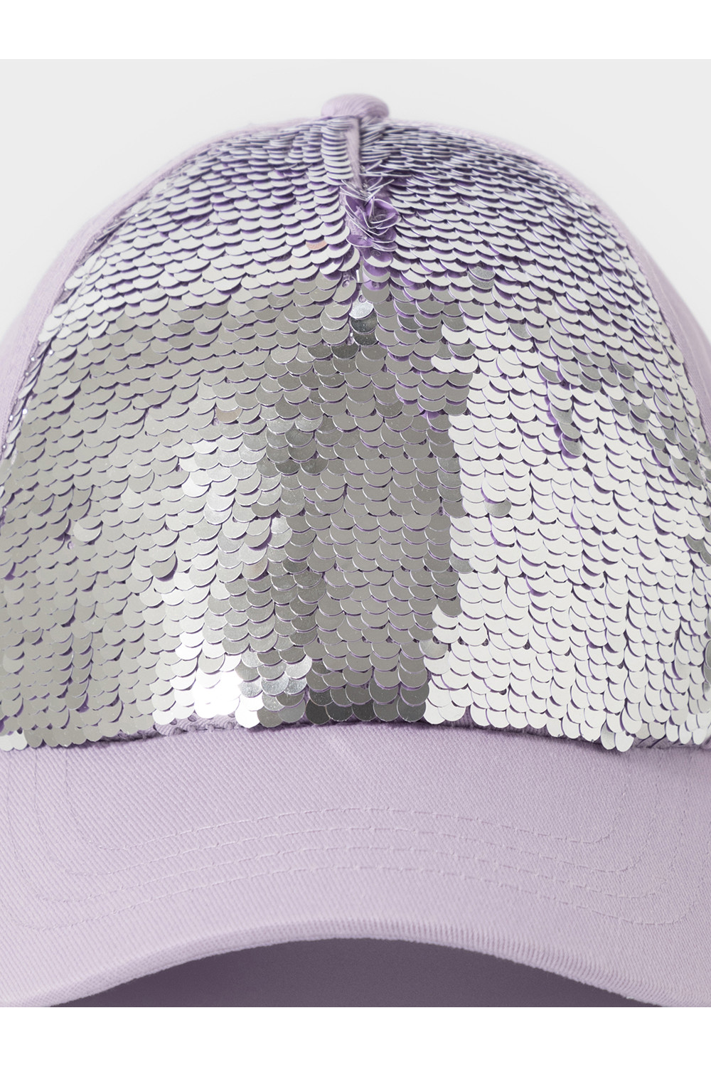 Кепка для девочки из натурального хлопка. Спереди украшена пайетками. Регулируется по ширине головы и фиксируется на затылке с помощью металлического зажима.