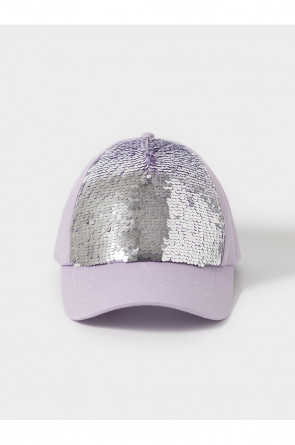 Кепка для девочки из натурального хлопка. Спереди украшена пайетками. Регулируется по ширине головы и фиксируется на затылке с помощью металлического зажима.