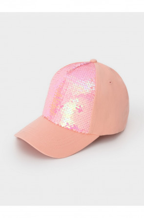 Кепка для девочки из натурального хлопка. Спереди украшена пайетками. Регулируется по ширине головы и фиксируется на затылке с помощью металлического зажима.