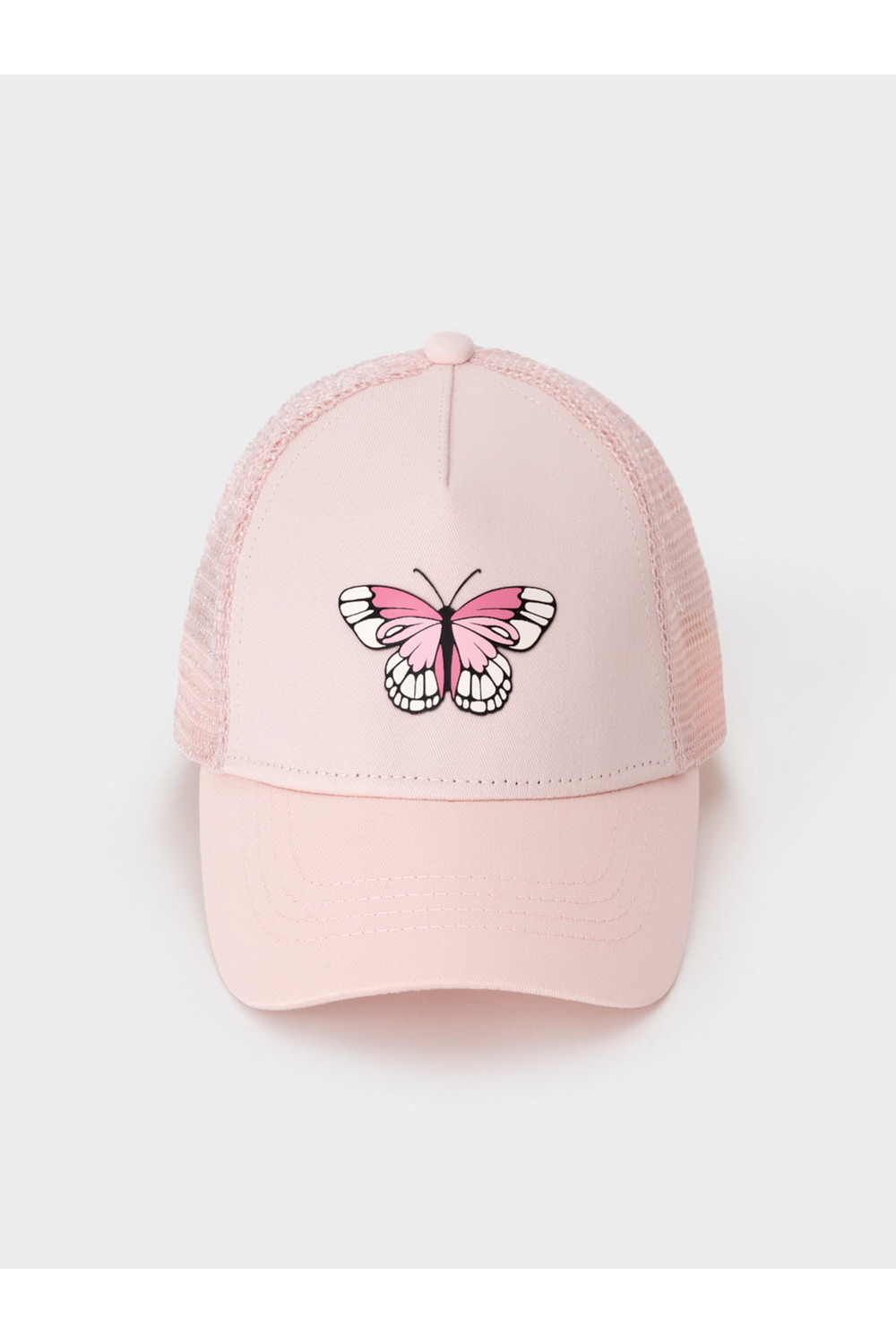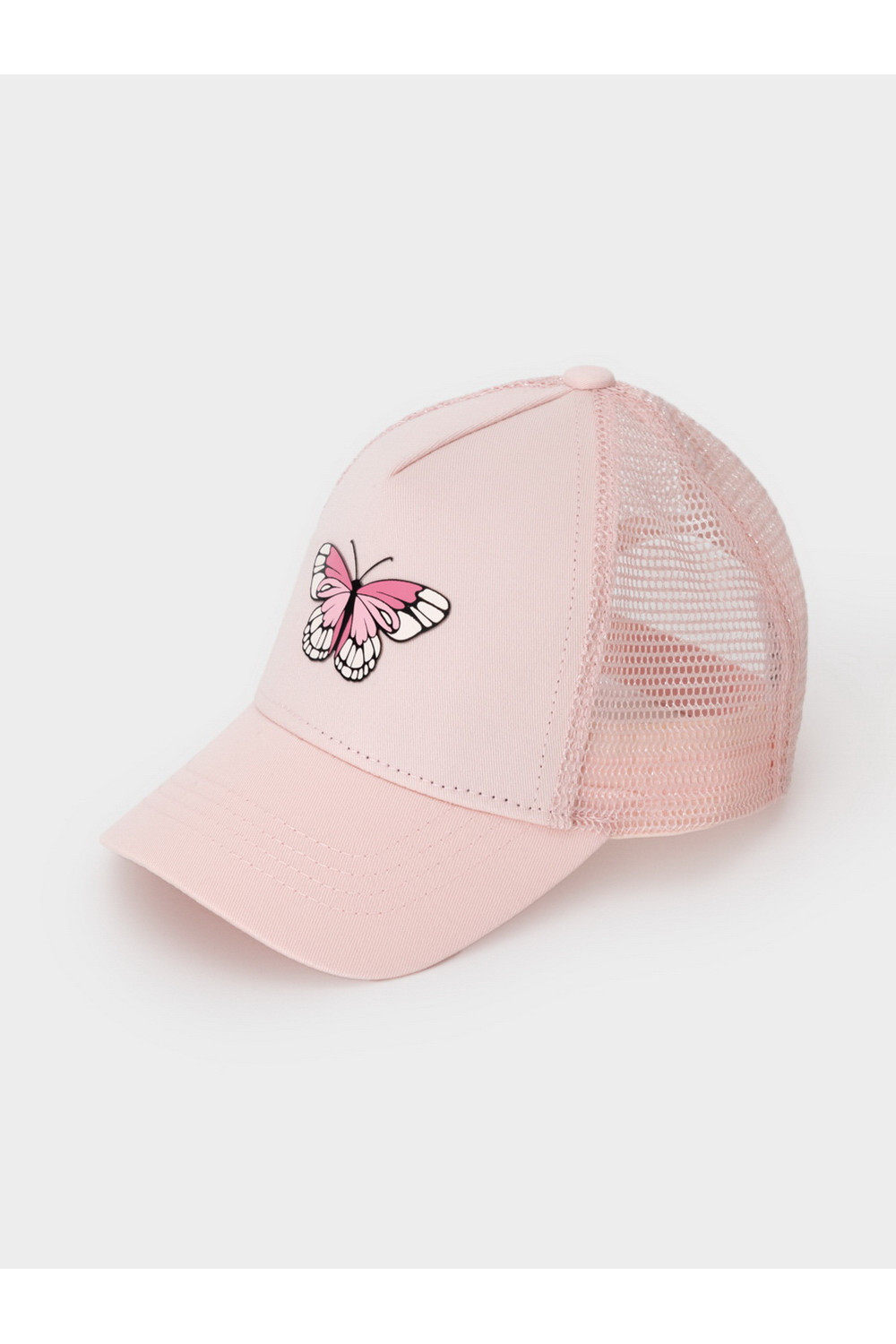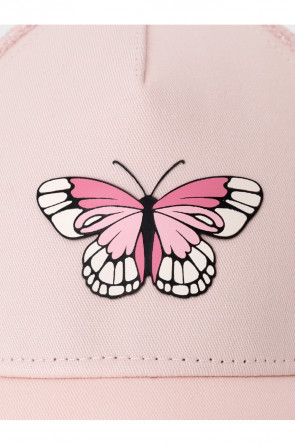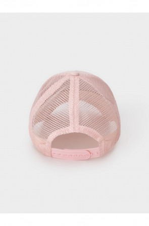 Кепка для девочки из текстиля и сетки. Спереди украшена оригинальной нашивкой. Регулируется по ширине головы и фиксируется на затылке с помощью пластиковой застёжки.