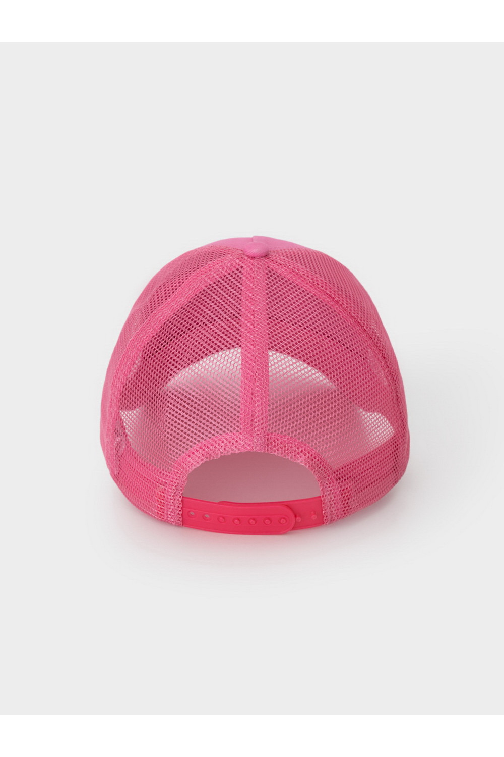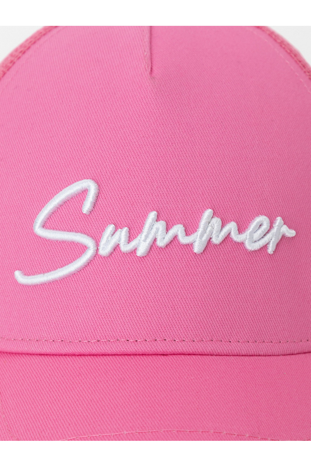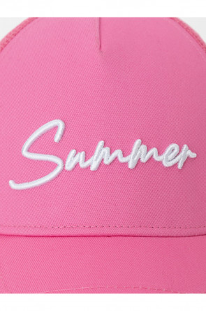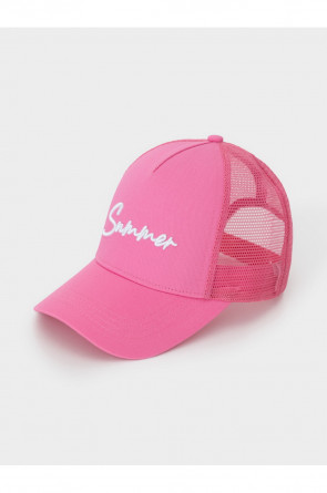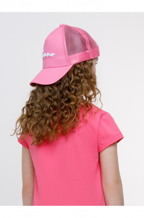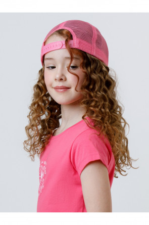 Кепка для девочки из текстиля и сетки. Спереди украшена оригинальной вышивкой. Регулируется по ширине головы и фиксируется на затылке с помощью пластиковой застёжки.